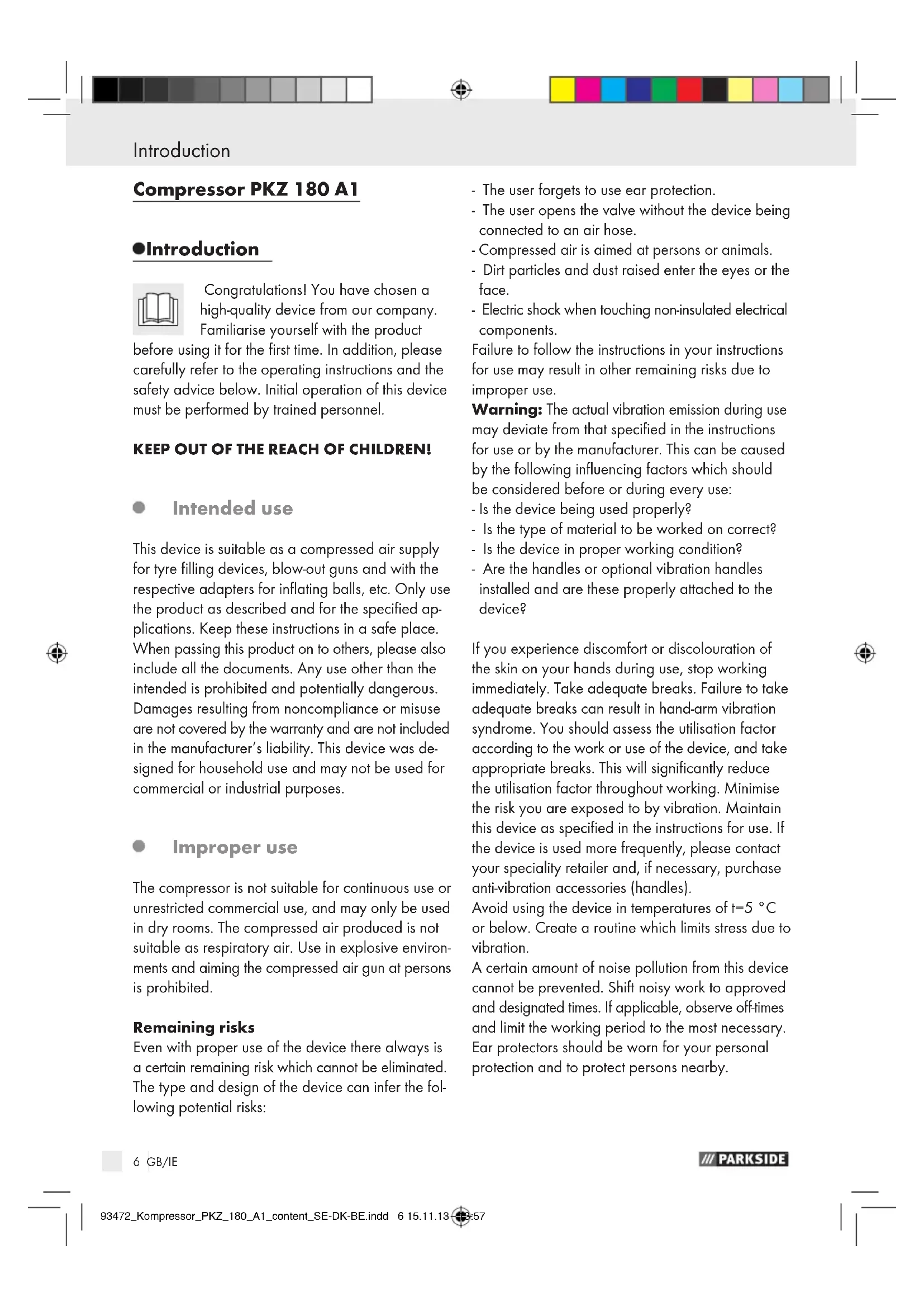 may deviate from that specified in the instructions for use or by the manufacturer. This can be caused by the following influencing factors which should be considered before or during every use: - Is the device being used properly? - Is the type of material to be worked on correct? - Is the device in proper working condition? - Are the handles or optional vibration handles installed and are these properly attached to the device? If you experience discomfort or discolouration of the skin on your hands during use, stop working immediately. Take adequate breaks. Failure to take adequate breaks can result in hand-arm vibration syndrome. You should assess the utilisation factor according to the work or use of the device, and take appropriate breaks. This will significantly reduce the utilisation factor throughout working. Minimise the risk you are exposed to by vibration. Maintain this device as specified in the instructions for use. If the device is used more frequently, please contact your speciality retailer and, if necessary, purchase anti-vibration accessories (handles). Avoid using the device in temperatures of t=5 °C or below. Create a routine which limits stress due to vibration. A certain amount of noise pollution from this device cannot be prevented. Shift noisy work to approved and designated times. If applicable, observe off-times and limit the working period to the most necessary. Ear protectors should be worn for your personal protection and to protect persons nearby. 93472_Kompressor_PKZ_180_A1_content_SE-DK-BE.indd 6 15.11.13 13:577 GB/IE Introduction / General safety instructions for air tools Features Check that all the items are present and that the product is in perfect condition immediately after unpacking. Never use the product if it is defective.