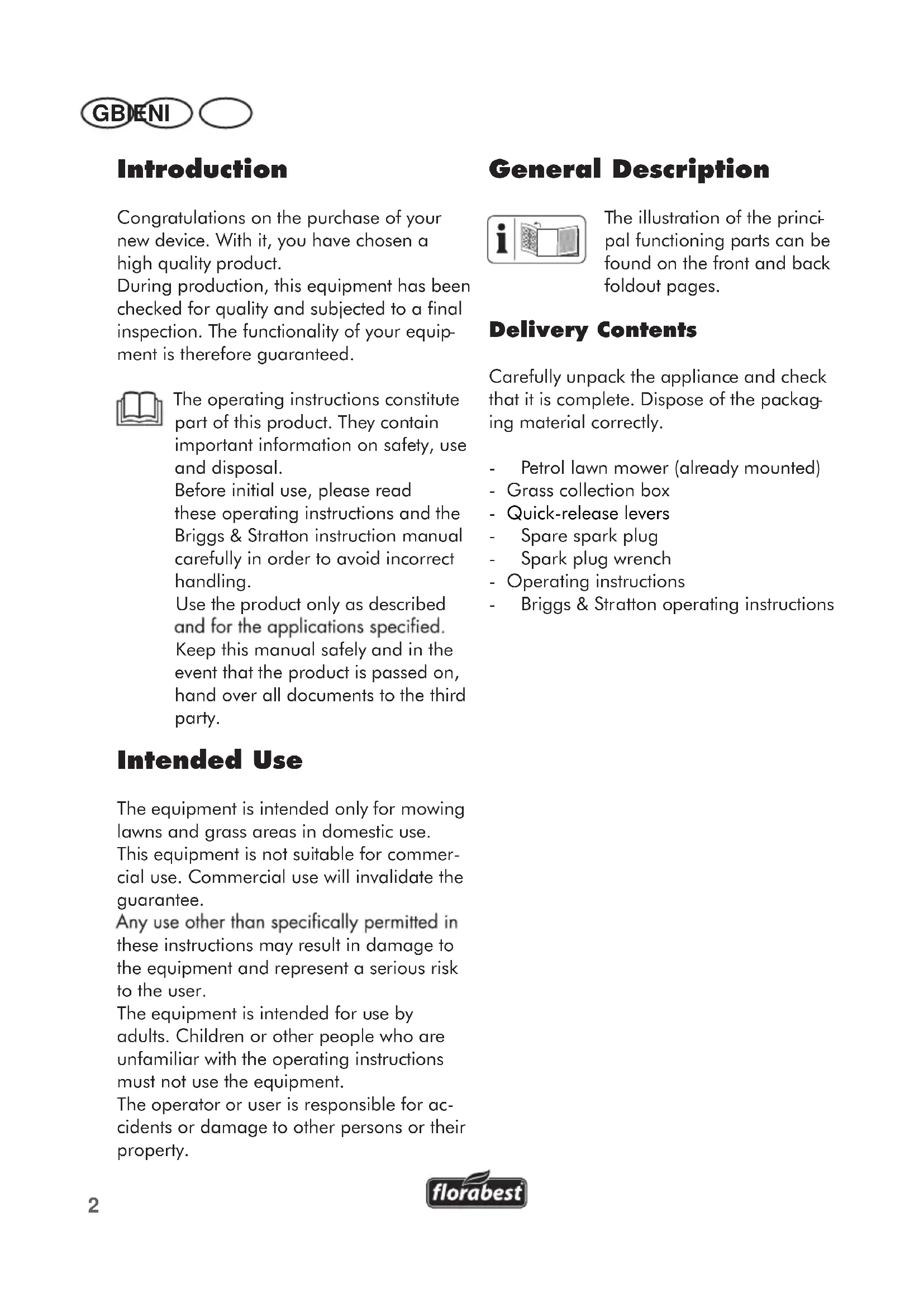 - Translation of the original EC declaration of conformity GB IE NI2 Introduction Congratulations on the purchase of your new device. With it, you have chosen a high quality product. During production, this equipment has been checked for quality and subjected to a final inspection. The functionality of your equip- ment is therefore guaranteed. The operating instructions constitute part of this product. They contain important information on safety, use and disposal. Before initial use, please read these operating instructions and the Briggs & Stratton instruction manual carefully in order to avoid incorrect handling. Use the product only as described Keep this manual safely and in the event that the product is passed on, hand over all documents to the third party. Intended Use The equipment is intended only for mowing lawns and grass areas in domestic use. This equipment is not suitable for commer- cial use. Commercial use will invalidate the guarantee. these instructions may result in damage to the equipment and represent a serious risk to the user. The equipment is intended for use by adults. Children or other people who are unfamiliar with the operating instructions must not use the equipment. The operator or user is responsible for ac- cidents or damage to other persons or their property. General Description The illustration of the princi- pal functioning parts can be found on the front and back foldout pages. Delivery Contents Carefully unpack the appliance and check that it is complete. Dispose of the packag- ing material correctly. - Petrol lawn mower (already mounted) - Grass collection box - Quick-release levers - Spare spark plug - Spark plug wrench - Operating instructions - Briggs & Stratton operating instructions GB IE NI3 Summary 1 Upper handle 2 Safety catch 3 Starter cord guide 4 Bottom handle 5 Bowden cable 6 Cable clamp 7 Starter handle with starter cord 8 Filler cap p. 109