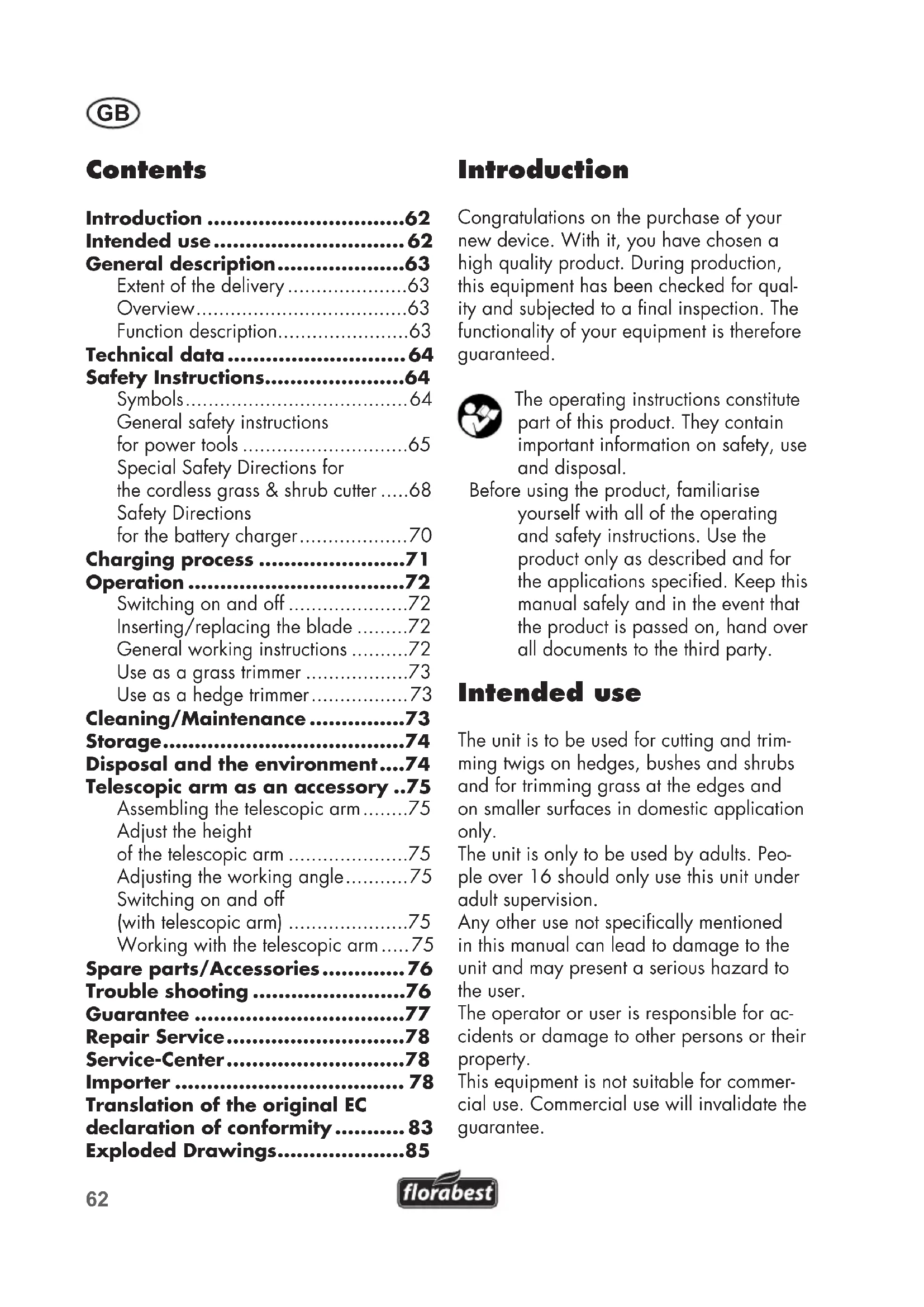 - Introduction Congratulations on the purchase of your new device. With it, you have chosen a high quality product. During production, this equipment has been checked for qual- ity and subjected to a nal inspection. The functionality of your equipment is therefore guaranteed. The operating instructions constitute part of this product. They contain important information on safety, use and disposal. Before using the product, familiarise yourself with all of the operating and safety instructions. Use the product only as described and for the applications specied. Keep this manual safely and in the event that the product is passed on, hand over all documents to the third party. Intended use The unit is to be used for cutting and trim- ming twigs on hedges, bushes and shrubs and for trimming grass at the edges and on smaller surfaces in domestic application only. The unit is only to be used by adults. Peo- ple over 16 should only use this unit under adult supervision. Any other use not specically mentioned in this manual can lead to damage to the unit and may present a serious hazard to the user. The operator or user is responsible for ac- cidents or damage to other persons or their property. This equipment is not suitable for commer- cial use. Commercial use will invalidate the guarantee. Contents Introduction p. 62
