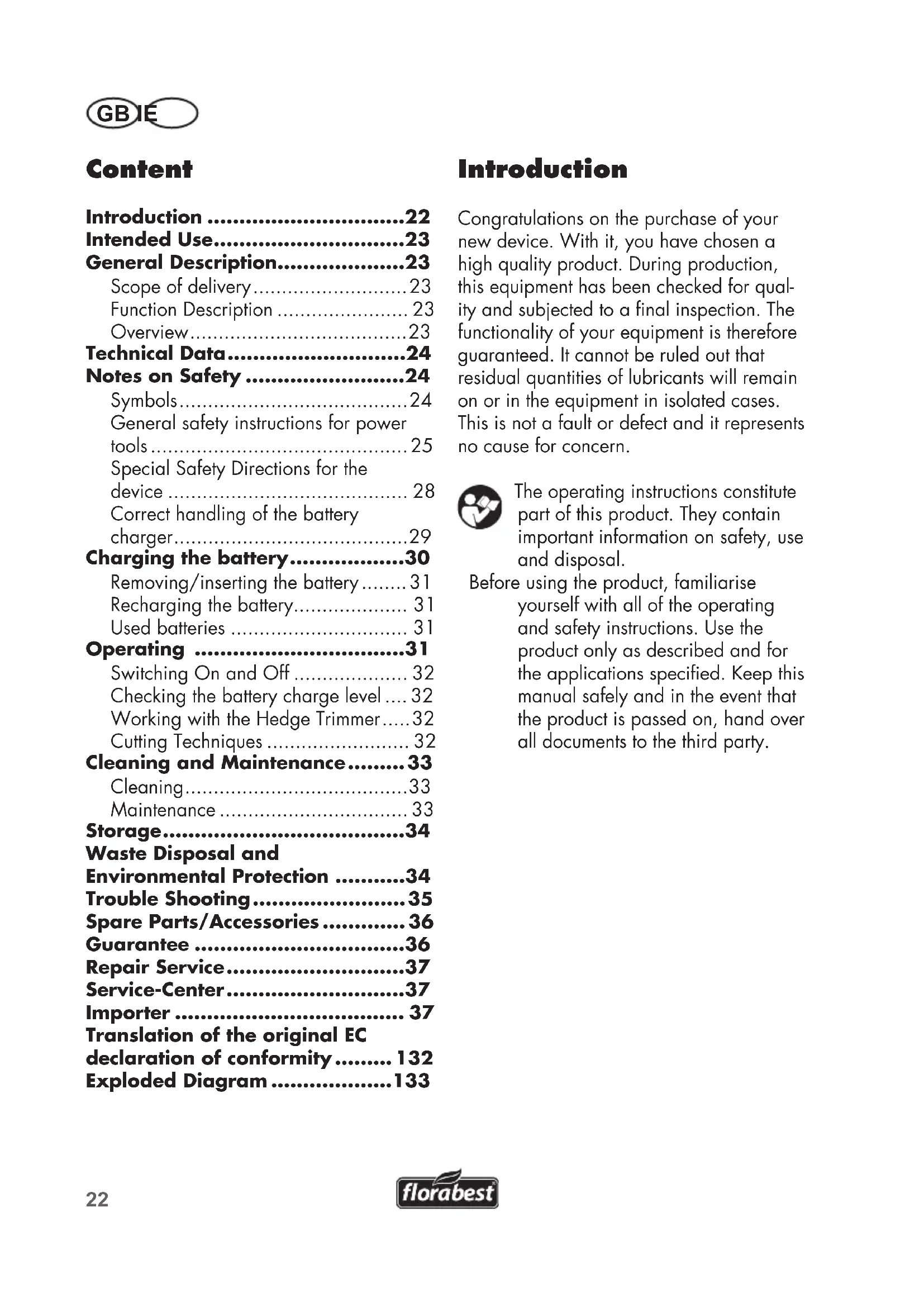 incorrect operation. Before use, check that the blades are sharp. Ensure that the blades are sharpened whenever blunt, in order to avoid overstressing of the machine. Damages caused by cut- ting with blunt blades are not cov- ered by the guarantee. General Description See the front fold-out page for illustrations. Scope of delivery Carefully unpack the trimmer and check that it is complete. Dispose of the packag- ing material correctly. - Cordless hedge trimmer - Knife guard - Battery - Battery charger - Instruction Manual Function Description The cordless hedge trimmer features a high- quality knife made from special lasercut steel. When trimming, the cutting teeth move to and fro in a linear shearing mo- tion. The strike guard at the tip of the knife prevents unpleasant kickback reactions when hitting walls, fences, etc. Operators are protected by the appliance’s two-hand safety switch and quick-stop brake function. The hand protection guards your hands against twigs and branches. Read the sec- tions below to learn more about each oper- ating element’s function. Overview 1 Strike guard 2 Safety knife bar 3 Hand protection 4 Safety switch 5 Front handle 6 Ventilation slots 7 On/Off switch 8 Rear handle 9 Battery 10 Battery release buttons 11 Battery charge state indicator (LED) 12 Battery charger 13 Knife guard 13a Suspension blade guard 14 Guide track 15 Button for state of charge display24 GB IE Technical Data Appliance ...................... FAH 18 C4 Motor voltage ..................18 V ; 2.0 Ah Idling speed ...................1300 min