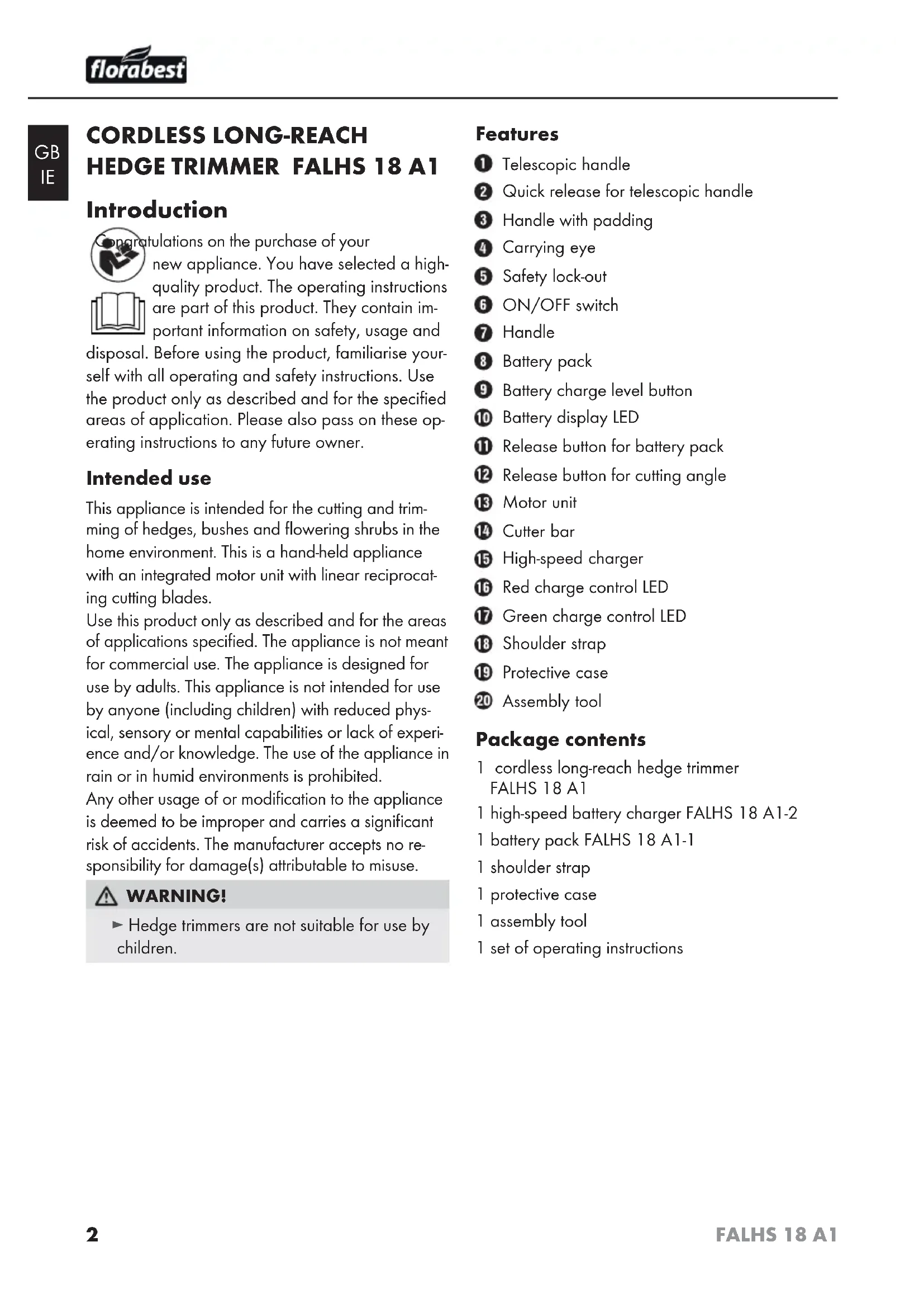 Introduction Congratulations on the purchase of your new appliance. You have selected a high- quality product. The operating instructions are part of this product. They contain im- portant information on safety, usage and disposal. Before using the product, familiarise your- self with all operating and safety instructions. Use the product only as described and for the specified areas of application. Please also pass on these op- erating instructions to any future owner. Intended use This appliance is intended for the cutting and trim- ming of hedges, bushes and flowering shrubs in the home environment. This is a hand-held appliance with an integrated motor unit with linear reciprocat- ing cutting blades. Use this product only as described and for the areas of applications specified. The appliance is not meant for commercial use. The appliance is designed for use by adults. This appliance is not intended for use by anyone (including children) with reduced phys- ical, sensory or mental capabilities or lack of experi- ence and/or knowledge. The use of the appliance in rain or in humid environments is prohibited. Any other usage of or modification to the appliance is deemed to be improper and carries a significant risk of accidents. The manufacturer accepts no re- sponsibility for damage(s) attributable to misuse. WARNING! ► Hedge trimmers are not suitable for use by children. Features Telescopic handle Quick release for telescopic handle Handle with padding Carrying eye Safety lock-out ON/OFF switch Handle Battery pack Battery charge level button Battery display LED Release button for battery pack Release button for cutting angle Motor unit Cutter bar High-speed charger Red charge control LED Green charge control LED Shoulder strap Protective case Assembly tool Package contents 1 cordless long-reach hedge trimmer FALHS 18 A1 1 high-speed battery charger FALHS 18 A1-2 1 battery pack FALHS 18 A1-1 1 shoulder strap 1 protective case 1 assembly tool 1 set of operating instructions3 FALHS 18 A1