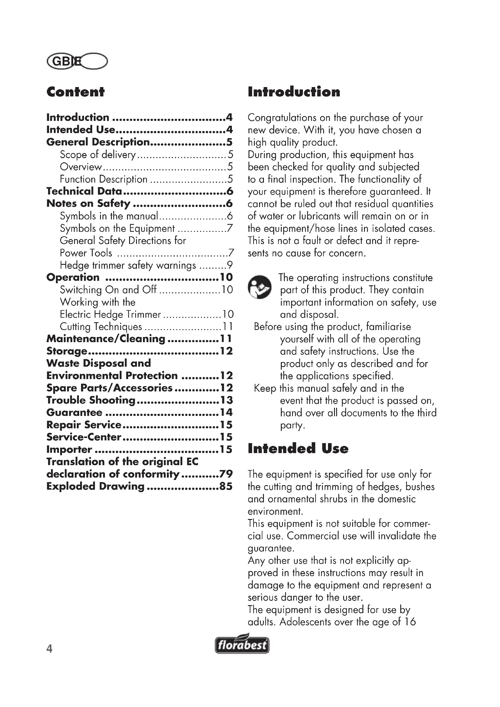 GB IE Content Introduction .................................4 Intended Use ................................ 4 General Description ......................5 Scope of delivery ............................. 5 Overview ........................................ 5 Function Description .........................5 Technical Data ..............................6 Notes on Safety ...........................6 Symbols in the manual ......................6 Symbols on the Equipment ................7 General Safety Directions for Power Tools ....................................7 Hedge trimmer safety warnings .........9 Operation .................................10 Switching On and Off ....................10 Working with the Electric Hedge Trimmer ...................10 Cutting Techniques .........................11 Maintenance/Cleaning ...............11 Storage ......................................12 Waste Disposal and Environmental Protection ...........12 Spare Parts/Accessories .............12 Trouble Shooting ........................13 Guarantee .................................14 Repair Service ............................15 Service-Center ............................15 Importer ....................................15 Translation of the original EC declaration of conformity ...........79 Exploded Drawing .....................85 Introduction Congratulations on the purchase of your new device. With it, you have chosen a high quality product. During production, this equipment has been checked for quality and subjected to a nal inspection. The functionality of your equipment is therefore guaranteed. It cannot be ruled out that residual quantities of water or lubricants will remain on or in the equipment/hose lines in isolated cases. This is not a fault or defect and it repre- sents no cause for concern. The operating instructions constitute part of this product. They contain important information on safety, use and disposal. Before using the product, familiarise yourself with all of the operating and safety instructions. Use the product only as described and for the applications specied. Keep this manual safely and in the event that the product is passed on, hand over all documents to the third party. Intended Use The equipment is specied for use only for the cutting and trimming of hedges, bushes and ornamental shrubs in the domestic environment. This equipment is not suitable for commer- cial use. Commercial use will invalidate the guarantee. Any other use that is not explicitly ap- proved in these instructions may result in damage to the equipment and represent a serious danger to the user. The equipment is designed for use by adults. Adolescents over the age of 165 GB IE may use the device only under supervision. Do not use the hedge trimmer in the rain or on wet hedges. The operator or user is responsible for ac- cidents or damage to other people or their property. The manufacturer is not liable for damages caused by unspecied use or incorrect operation. Before use, check that the blades are sharp. Ensure that the blades are sharpened whenever blunt, in order to avoid overstressing of the machine. Damages caused by cut- ting with blunt blades are not cov- ered by the guarantee. General Description See the front fold-out page for illustrations. Scope of delivery Unpack the device and check it for com- pleteness. Dispose of the packaging mate- rial correctly. - Electric hedge trimmer - Blade protection - Instruction Manual Overview 1 Impact protection with drill hole for hanging up the device 2 Cutter bar 3 Hand protection 4 Loop grip with deadman switch 5 Vents 6 On/off switch 7 Tension relief 8 Grip 9 Mains cable 10 Blade protection Function Description The electric hedge trimmer is driven by an electronic motor. The equipment is double- insulated for safety and does not require earthing. The hedge trimmer is equipped with a dou- ble-sided safety cutter bar. When cutting, the blades move backwards and forwards in linear motion. The impact protection on the tip of the cutter bar prevents unpleasant recoils should the trimmer come into con- tact with walls, fences and so on. The unit can only be operated with the deadman switch depressed, in order to protect the operator. In addition, the hand guard protects against branches and bri- ars. Please note the following descriptions for the function of the operating components.6 GB IE Technical Data Electrical Hedge Trimmer ......... FHT 600 D3 Input voltage rating ... 230-240 V~, 50 Hz Input power (power consumption) ..600 W Safety class .....................................