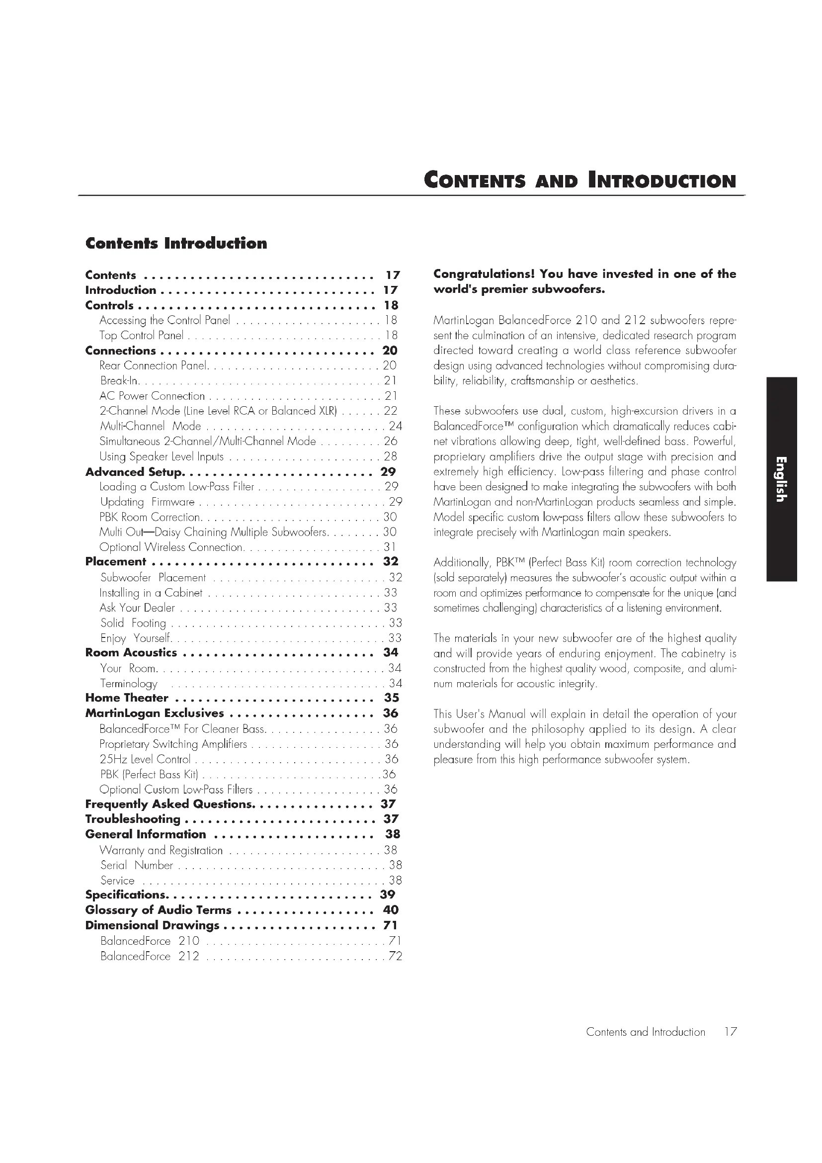 - If the problem persists, contact your dealer.38 General Information general InFormatIon English Warranty and Registration Your subwoofer is provided with an automatic Limited 90 Day Warranty coverage. You have the option, at no additional charge, to receive Limited 3-Year Warranty coverage. To obtain the Limited 3-Year Warranty coverage you need to complete and return the Certificate of Registration, included with your subwoofer, and provide a copy of your dealer receipt, to MartinLogan within 30 days of purchase. For your convenience MartinLogan also offers online warranty registration at www.martinlogan.com. MartinLogan may not honor warranty service claims unless we have a completed Warranty Registration card on file! If you did not receive a Certificate of Registration with your new subwoofer you cannot be assured of having received a new unit. If this is the case, please contact your authorized MartinLogan dealer. Serial Number The serial number is located near the bottom of the backplate. The serial number is also located on the shipping carton. Each individual unit has a unique serial number. Service In the rare event that your MartinLogan product should require service please contact the dealer from whom the product was purchased. In most cases your dealer will be able to assist you in troubleshooting and resolving the issue. If the dealer is unable resolve the issue or if there is no local dealer in your area contact MartinLogan customer service directly by using the service request form at www.martinlogan.com or by calling 785-749-0133. Before returning any product to MartinLogan for service first contact the service department for an RMA number. Incoming shipments will only be accepted if labeled with a MartinLogan issued RMA number. Should you be using a MartinLogan product in a country other than the one in which it was originally purchased, please note the following: 1 The appointed MartinLogan distributor for any given country is responsible for warranty servicing only on units distributed by or through it in that country in accordance with its applicable warranty. 2 Should a MartinLogan product require servicing in a country other than the one in which it was originally purchased the end user may seek to have repairs performed by the nearest MartinLogan distributor, subject to that distributor's local servic- ing policies. All cost of repairs (parts, labor, and transportation) must be born by the owner of the MartinLogan product. 3 If, after owning your MartinLogan product for six months, you relocate to a country other than the one in which it was purchased, your warranty may be transferable. Contact MartinLogan for details.Specifications 39 speCIFICatIons English System Frequency Response.... Low Pass Filter Frequencies .... Phase .................... 25Hz Level Control........... Power .................... Woofers................... Amplifiers ................. Inputs (RCA)................ Inputs (XLR) ................ Inputs (Speaker Level) ........ Inputs (12V Trigger) .......... Inputs (USB) ................ Output (RCA) ............... Input Impedance ............ Power Draw ............... Weight.................... Size (H x W x D) ............ BalancedForce 210* 20–120 Hz ±3dB. Anechoic through the LFE effects input. 30–80Hz 0°, 90°, 180°, 270° ±10dB On, Auto (12V Trigger), Off 2 x 10” (25.4cm) cast-basket, high- excursion, aluminum cone with extended throw driver assembly, sealed non-reso- nant asymmetrical chamber format 850 watts (1,700 watts peak) Left, Right, and LFE Left, Right, and LFE Left and Right via banana jacks 3.5mm Mini USB (for PBK), USB (for crossover & firmware updates) Multi Out (for multi-sub connection) RCA: 10,000 Ohms XLR: 15,000 Ohms per phase Speaker Level: 10,000 Ohms per phase (20,000 Ohms red to black) Typical: 125 Watts Idle: 15 Watts 96 lbs. (43.5 kg) 19 x 19.1 x 19.4 inches (48.3 x 48.6 x 49.4 cm) *Specifications are subject to change without notice. BalancedForce 212* 18–120 Hz ±3dB. Anechoic through the LFE effects input. 30–80Hz 0°, 90°, 180°, 270° ±10dB On, Auto (12V Trigger), Off 2 x 12” (30.5cm) cast-basket, high- excursion, aluminum cone with extended throw driver assembly, sealed non-reso- nant asymmetrical chamber format 2 x 850 watts (3,400 watts peak system total) Left, Right, and LFE Left, Right, and LFE Left and Right via banana jacks 3.5mm Mini USB (for PBK), USB (for crossover & firmware updates) Multi Out (for multi-sub connection) RCA: 10,000 Ohms XLR: 15,000 Ohms per phase Speaker Level: 10,000 Ohms per phase (20,000 Ohms red to black) Typical: 250 Watts Idle: 30 Watts 140 lbs. (63.5 kg)