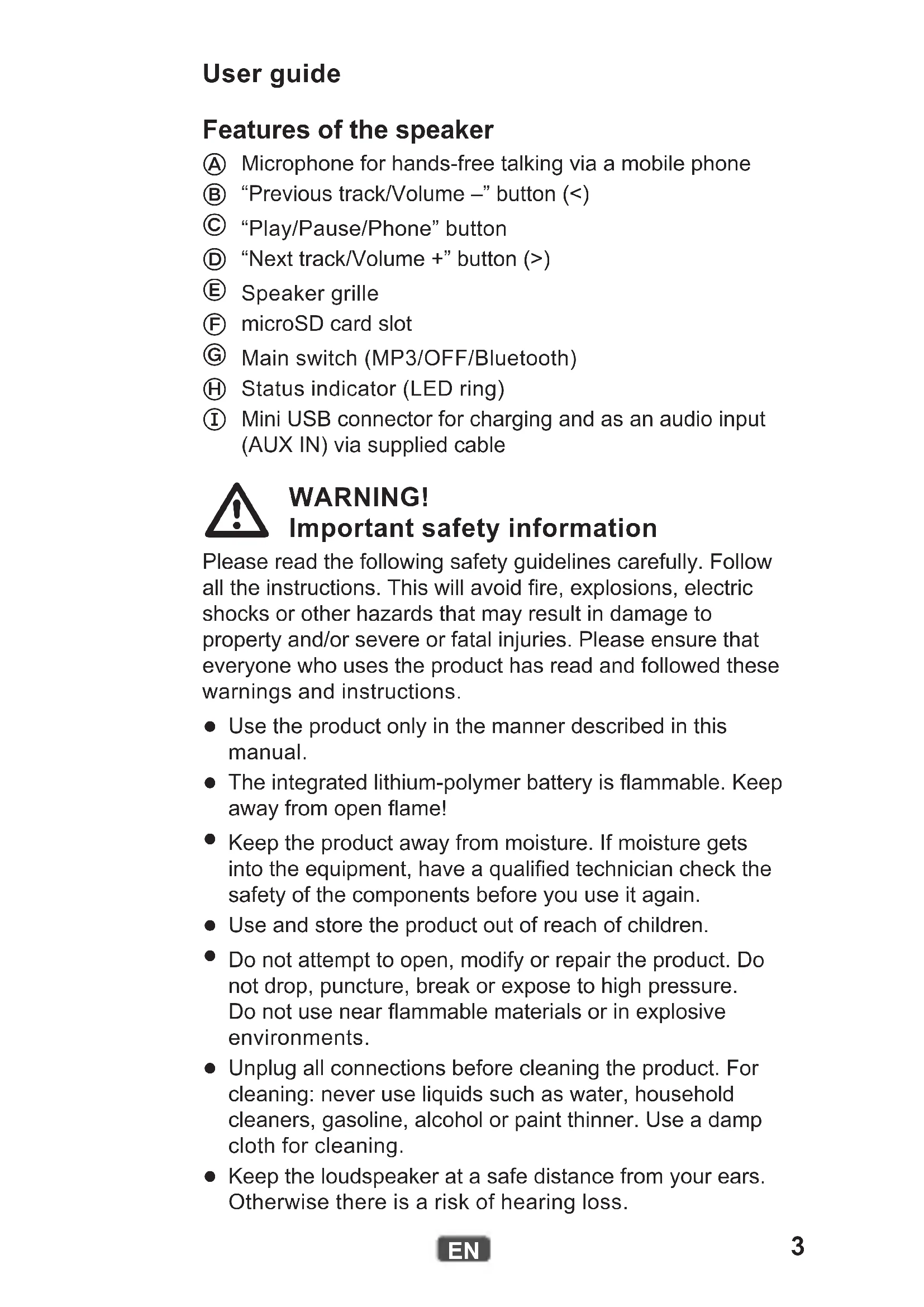 Mini USB connector for charging and as an audio input (AUX IN) via supplied cable WARNING! Important safety information Please read the following safety guidelines carefully. Follow all the instructions. This will avoid re, explosions, electric shocks or other hazards that may result in damage to property and/or severe or fatal injuries. Please ensure that everyone who uses the product has read and followed these warnings and instructions.