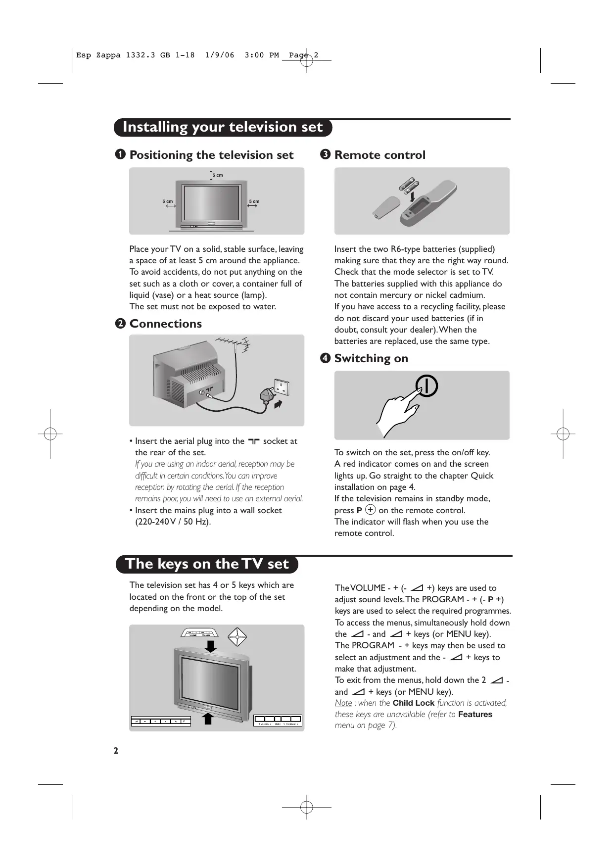 Esp Zappa 1332.3 GB 1-18 1/9/06 3:00 PM Page 2 Installing your television set & Positioning the television set “ Remote control 5 cm 5 cm 5 cm Place your TV on a solid, stable surface, leaving a space of at least 5 cm around the appliance. To avoid accidents, do not put anything on the set such as a cloth or cover, a container full of liquid (vase) or a heat source (lamp). The set must not be exposed to water. é Connections Insert the two R6-type batteries (supplied) making sure that they are the right way round. Check that the mode selector is set to TV. The batteries supplied with this appliance do not contain mercury or nickel cadmium. If you have access to a recycling facility, please do not discard your used batteries (if in doubt, consult your dealer).When the batteries are replaced, use the same type. ‘ Switching on