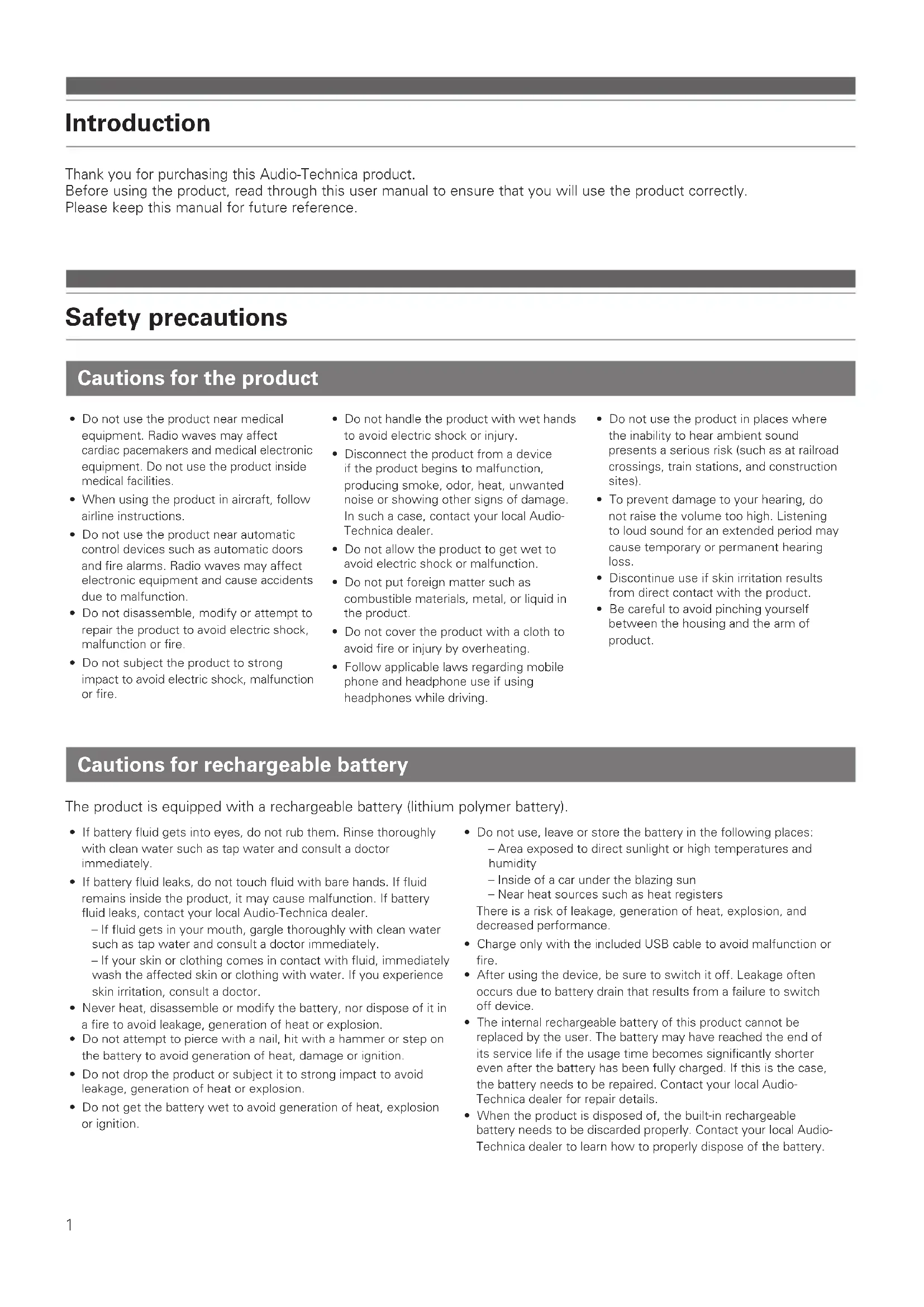 Memo1 Thank you for purchasing this Audio-Technica product. Before using the product, read through this user manual to ensure that you will use the product correctly. Please keep this manual for future reference. Introduction Cautions for the product Safety precautions