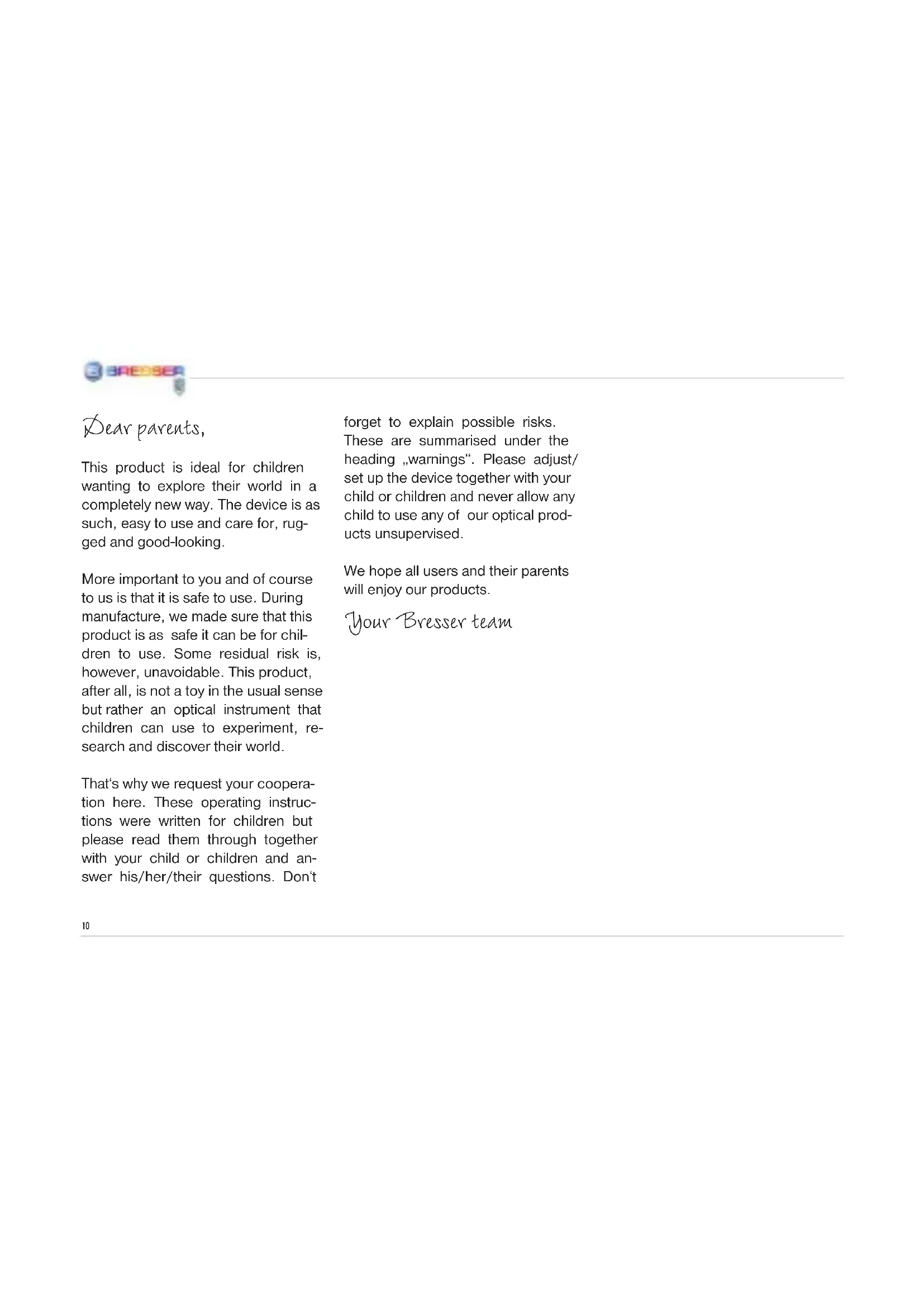 Dear junior researcher, Congratulations on becoming the proud owner of this product. You‘ll be amazed when reading these instructions just how much can be done and explored with your new device. Take a look and emerge yourself into the adventurous world of nature and discovery. It really is exciting and a lot of fun dis- covering the world with this product. Before you get started, read the op- erating instructions fully, as there are a few things you need to know to get the best out of your new device. The „Warnings“ should be read care- fully. Use the product exactly as per the operating instructions to avoid any risk or injury. Keep these instruc- tions in a safe place for later refer- ence. If you give the device away or make a present of it make sure these instructions accompany it. And now it just remains to say, „Have loads of fun researching and discov- ering“ Pia12 DANGER to your child! Aids with sharp edges and tips are sometimes used with this device. Please store the device and all of its accessories and aids out of the reach of children. There is a risk of INJURY. This device contains electronic com- ponents that are powered by either a mains connection or batteries. Never leave a child unsupervised with this device. The device should only be used as per these instructions other- wise there is a serious RISK of ELEC- TRICAL SHOCK. Batteries should be kept out of chil- dren’s reach. When inserting batter- ies please ensure the polarity is cor- rect. Leaking or damaged batteries can cause injury if they come into contact with the skin. If you need to handle such batteries please wear suitable safety gloves. Children should only use this device under supervision. Keep packaging materials (plastic bags, rubber bands, etc.) away from children. There is a risk of SUFFOCATION. FIRE-/ DANGER OF EXPLOSION! Do not expose the device to high temperatures. Use only the mains adapter supplied or those battery types recommended. Never short circuit the device or batteries or throw into a re. Exposure to high temperatures or misuse of the device can lead to short circuits, re or even explosion! RISK of material damage Never take the device apart. Please consult your dealer if there are any defects. The dealer will contact our service centre and send the device in for repair if needed. Do not subject the device to tempera- tures exceeding 60° C. TIPS on cleaning Remove the device from it’s energy source before cleaning (remove plug from socket / remove batteries). Clean the exterior of device with a dry cloth. Do not use cleaning uids so as to avoid causing damage to elec- tronic components. Protect the device from dust and moisture. Store the device in the bag supplied or in its original packaging. Batteries should be removed from the device if it is not going to be used for a long period of time. Clean the lens (objective and eye- piece) only with the cloth supplied or some other soft lint-free cloth (e.g. micro-bre). Do not use excessive pressure - this may scratch the lens.13