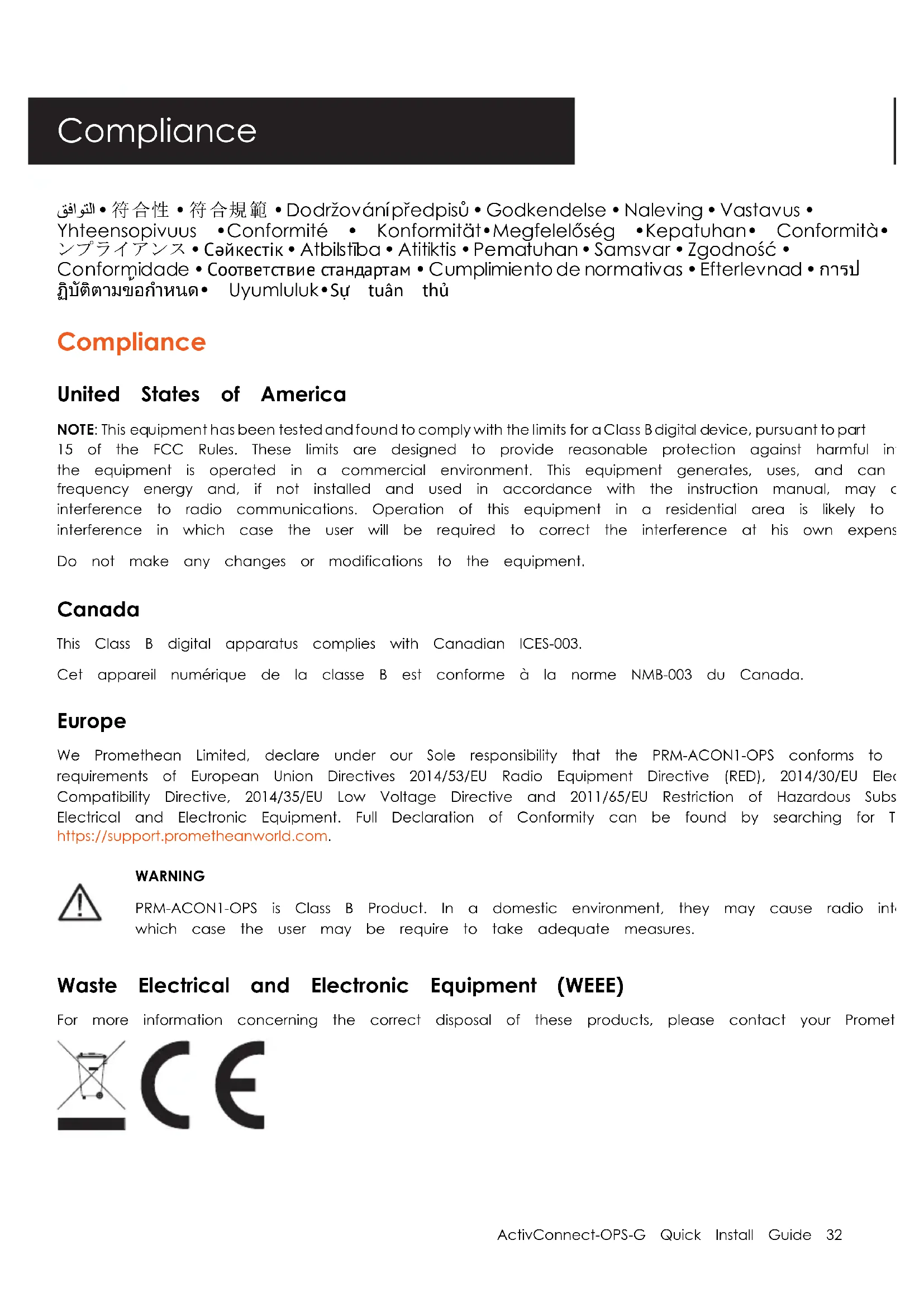 Europe PRM-ACON1-OPS We Promethean Limited, declare under our Sole responsibility that the PRM-ACON1-OPS conforms to the essential requirements of European Union Directives 2014/53/EU Radio Equipment Directive (RED), 2014/30/EU Electromagnetic Compatibility Directive, 2014/35/EU Low Voltage Directive and 2011/65/EU Restriction of Hazardous Substances in Electrical and Electronic Equipment. Full Declaration of Conformity can be found by searching for TP-2082 at https://support.prometheanworld.com. ActivConnect-OPS-G Quick Install Guide 34Type Frequency (MHz) Max power (dBm) BT 2402-2480 5.30 Wifi 2412-2472 18.18 Wifi 5180-5240 19.11 SRD 5745-5825 13.64 PRM-ACON1-OPS is for internal use only. The device complies with RFspecifications when the device is used at 20cm from your body. Promethean Ltd, Promethean House, Lower Phillips Road, Blackburn, Lancashire, BB1 5TH, United Kingdom