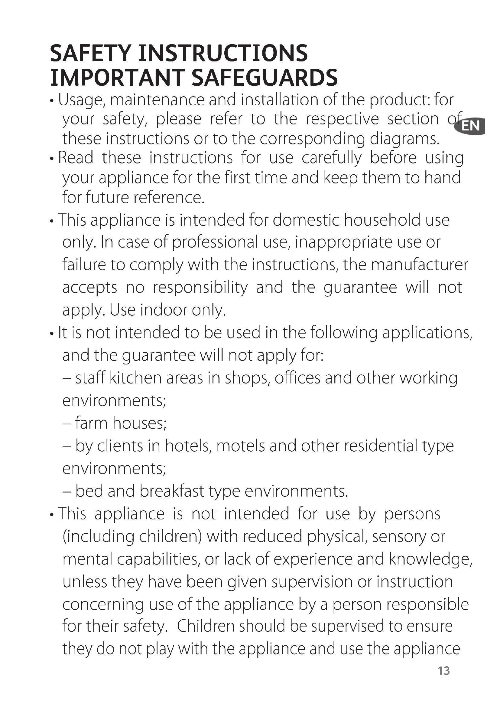 - This appliance is intended for domestic household use only. In case of professional use, inappropriate use or failure to comply with the instructions, the manufacturer accepts no responsibility and the guarantee will not apply. Use indoor only.