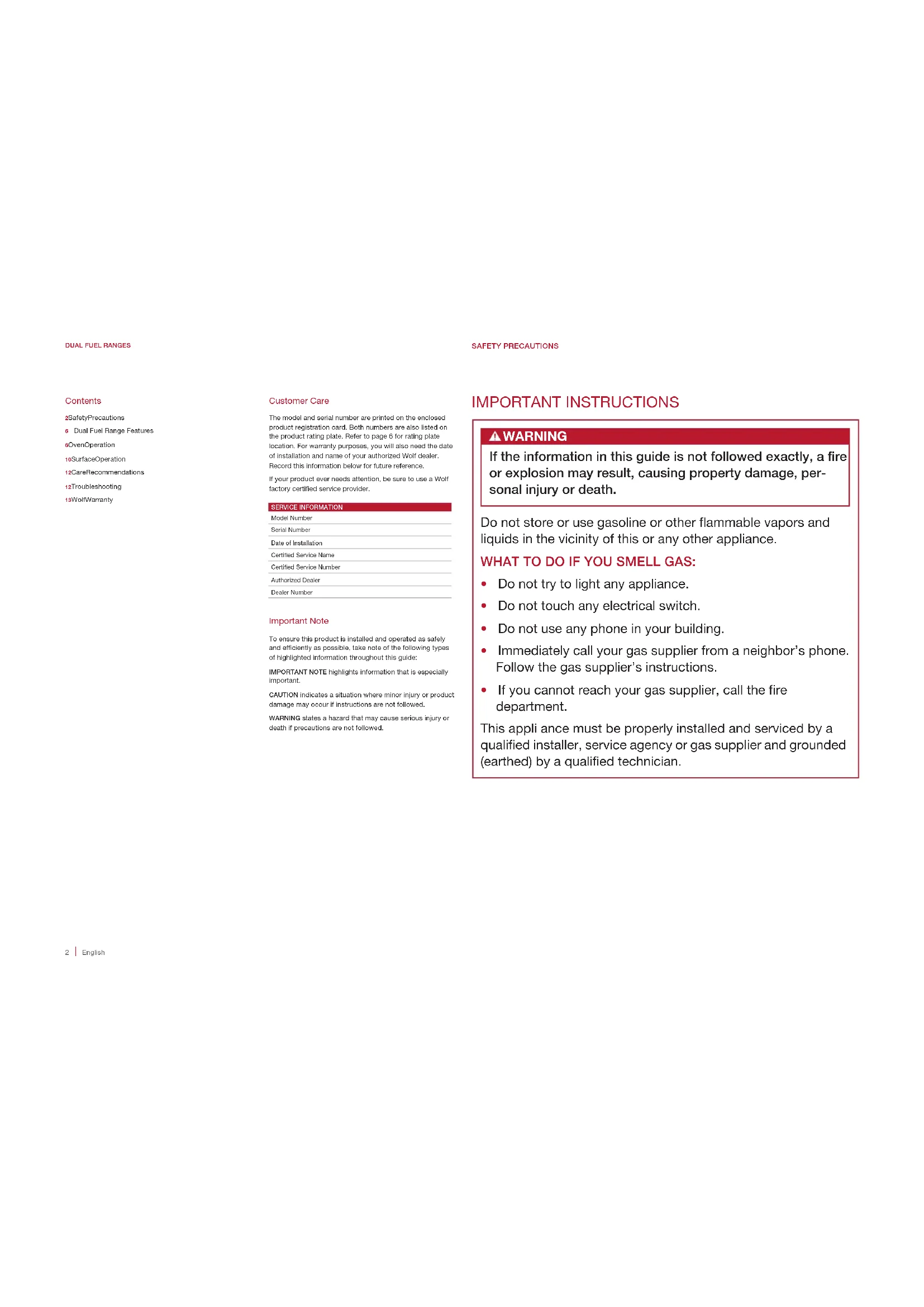 BEDIENUNGS-UND PFLEGEANLEITUNG2 English Contents 2 Safety Precautions6 Dual Fuel Range Features6 Oven Operation10 Surface Operation12 Care Recommendations12 Troubleshooting13 Wolf WarrantyDUAL FUEL RANGES Customer Care The model and serial number are printed on the enclosed product registration card. Both numbers are also listed on the product rating plate. Refer to page 6 for rating plate location. For warranty purposes, you will also need the date of installation and name of your authorized Wolf dealer. Record this information below for future reference. If your product ever needs attention, be sure to use a Wolf factory certied service provider.SERVICE INFORMATIONModel NumberSerial NumberDate of InstallationCertied Service NameCertied Service NumberAuthorized DealerDealer Number Important Note To ensure this product is installed and operated as safely and efciently as possible, take note of the following types of highlighted information throughout this guide:IMPORTANT NOTE highlights information that is especially important. CAUTION indicates a situation where minor injury or product damage may occur if instructions are not followed.WARNING states a hazard that may cause serious injury or death if precautions are not followed. IMPORTANT INSTRUCTIONS WARNING If the information in this guide is not followed exactly, a re or explosion may result, causing property damage, per- sonal injury or death. Do not store or use gasoline or other ammable vapors and liquids in the vicinity of this or any other appliance. WHAT TO DO IF YOU SMELL GAS: