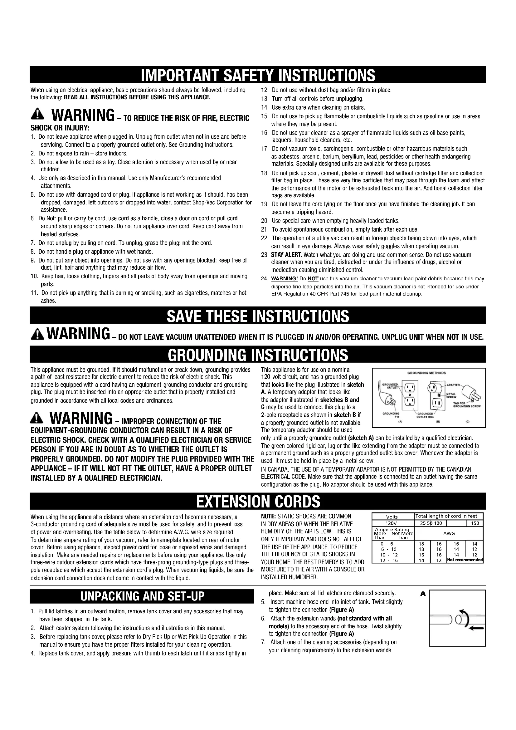 When using the appliance at a distance where an extension cord becomes necessary, a 3-conductor grounding cord of adequate size must be used for safety, and to prevent loss of power and overheating. Use the table below to determine A.W.G. wire size required. To determine ampere rating of your vacuum, refer to nameplate located on rear of motor cover. Before using appliance, inspect power cord for loose or exposed wires and damaged insulation. Make any needed repairs or replacements before using your appliance. Use only three-wire outdoor extension cords which have three-prong grounding-type plugs and three-pole receptacles which accept the extension cord's plug. When vacuuming liquids, be sure the extension cord connection does not come in contact with the liquid.