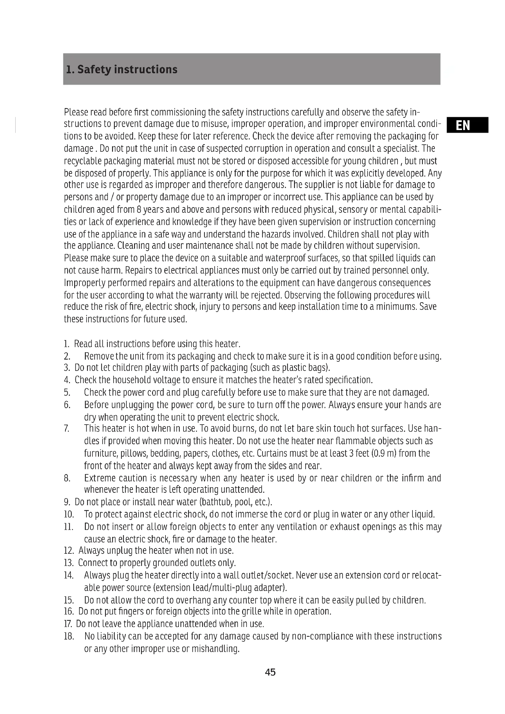 Please read before first commissioning the safety instructions carefully and observe the safety in- structions to prevent damage due to misuse, improper operation, and improper environmental condi- tions to be avoided. Keep these for later reference. Check the device after removing the packaging for damage . Do not put the unit in case of suspected corruption in operation and consult a specialist. The recyclable packaging material must not be stored or disposed accessible for young children , but must be disposed of properly. This appliance is only for the purpose for which it was explicitly developed. Any other use is regarded as improper and therefore dangerous. The supplier is not liable for damage to persons and / or property damage due to an improper or incorrect use. This appliance can be used by children aged from 8 years and above and persons with reduced physical, sensory or mental capabili- ties or lack of experience and knowledge if they have been given supervision or instruction concerning use of the appliance in a safe way and understand the hazards involved. Children shall not play with the appliance. Cleaning and user maintenance shall not be made by children without supervision. Please make sure to place the device on a suitable and waterproof surfaces, so that spilled liquids can not cause harm. Repairs to electrical appliances must only be carried out by trained personnel only. Improperly performed repairs and alterations to the equipment can have dangerous consequences for the user according to what the warranty will be rejected. Observing the following procedures will reduce the risk of fire, electric shock, injury to persons and keep installation time to a minimums. Save these instructions for future used.