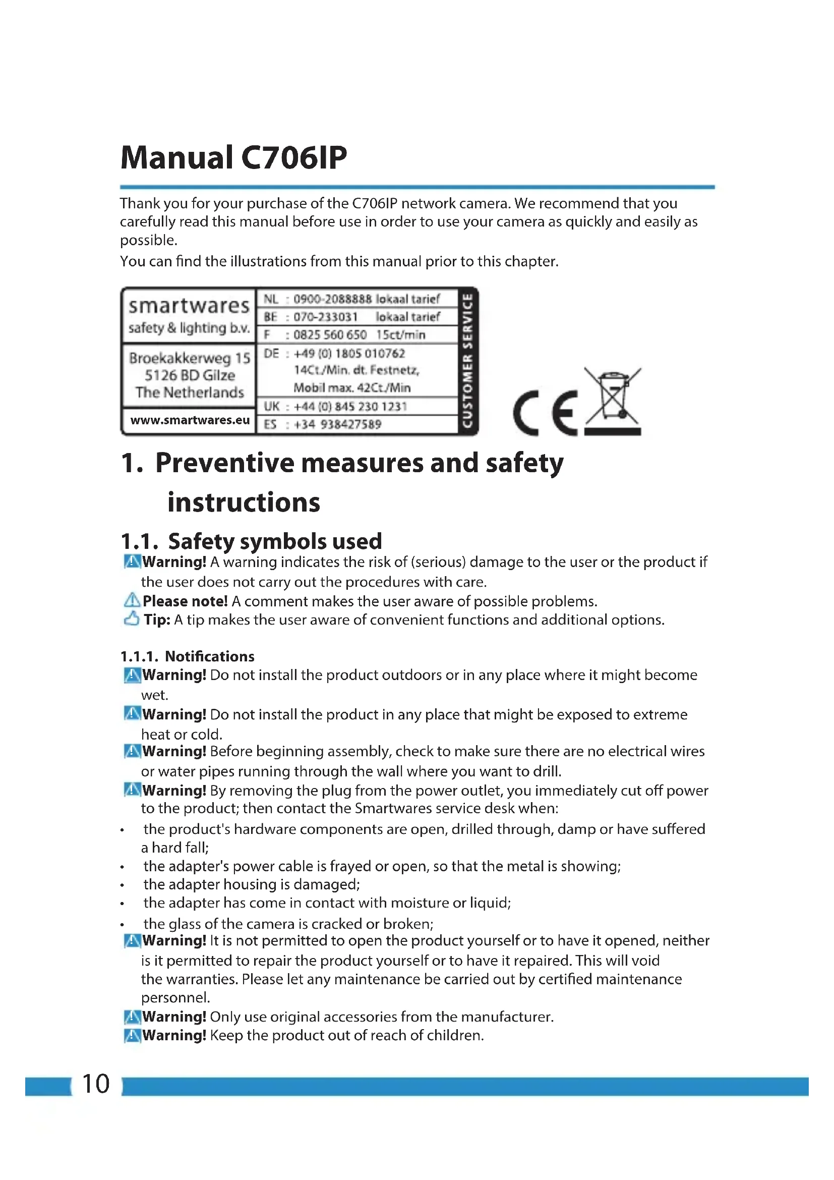 Manual C706IP Thank you for your purchase of the C706IP network camera. We recommend that you carefully read this manual before use in order to use your camera as quickly and easily as possible. You can nd the illustrations from this manual prior to this chapter. www.smartwares.eu