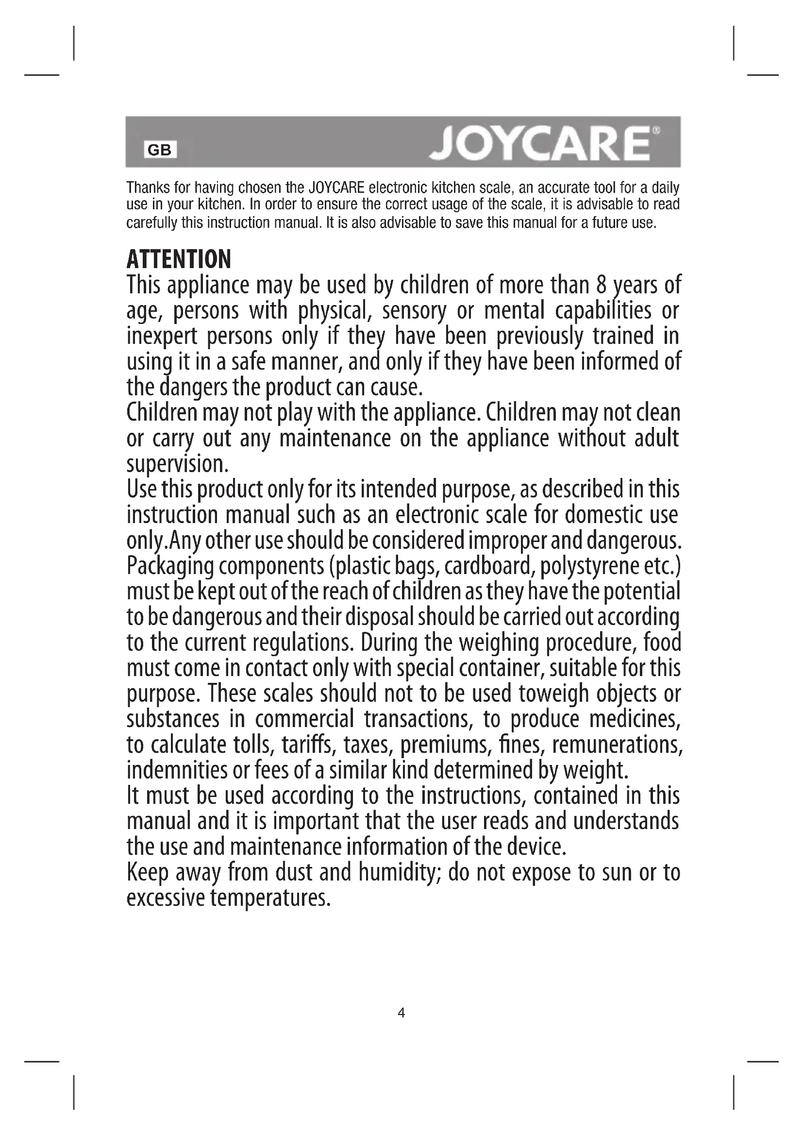 Thanks for having chosen the JOYCARE electronic kitchen scale, an accurate tool for a daily use in your kitchen. In order to ensure the correct usage of the scale, it is advisable to read carefully this instruction manual. It is also advisable to save this manual for a future use. ATTENTION This appliance may be used by children of more than 8 years of age, persons with physical, sensory or mental capabilities or inexpert persons only if they have been previously trained in using it in a safe manner, and only if they have been informed of the dangers the product can cause. Children may not play with the appliance. Children may not clean or carry out any maintenance on the appliance without adult supervision. Use this product only for its intended purpose, as described in this instruction manual such as an electronic scale for domestic use only.Any other use should be considered improper and dangerous. Packaging components (plastic bags, cardboard, polystyrene etc.) must be kept out of the reach of children as they have the potential to be dangerous and their disposal should be carried out according to the current regulations. During the weighing procedure, food must come in contact only with special container, suitable for this purpose. These scales should not to be used toweigh objects or substances in commercial transactions, to produce medicines, to calculate tolls, taris, taxes, premiums, nes, remunerations, indemnities or fees of a similar kind determined by weight. It must be used according to the instructions, contained in this manual and it is important that the user reads and understands the use and maintenance information of the device. Keep away from dust and humidity; do not expose to sun or to excessive temperatures.4