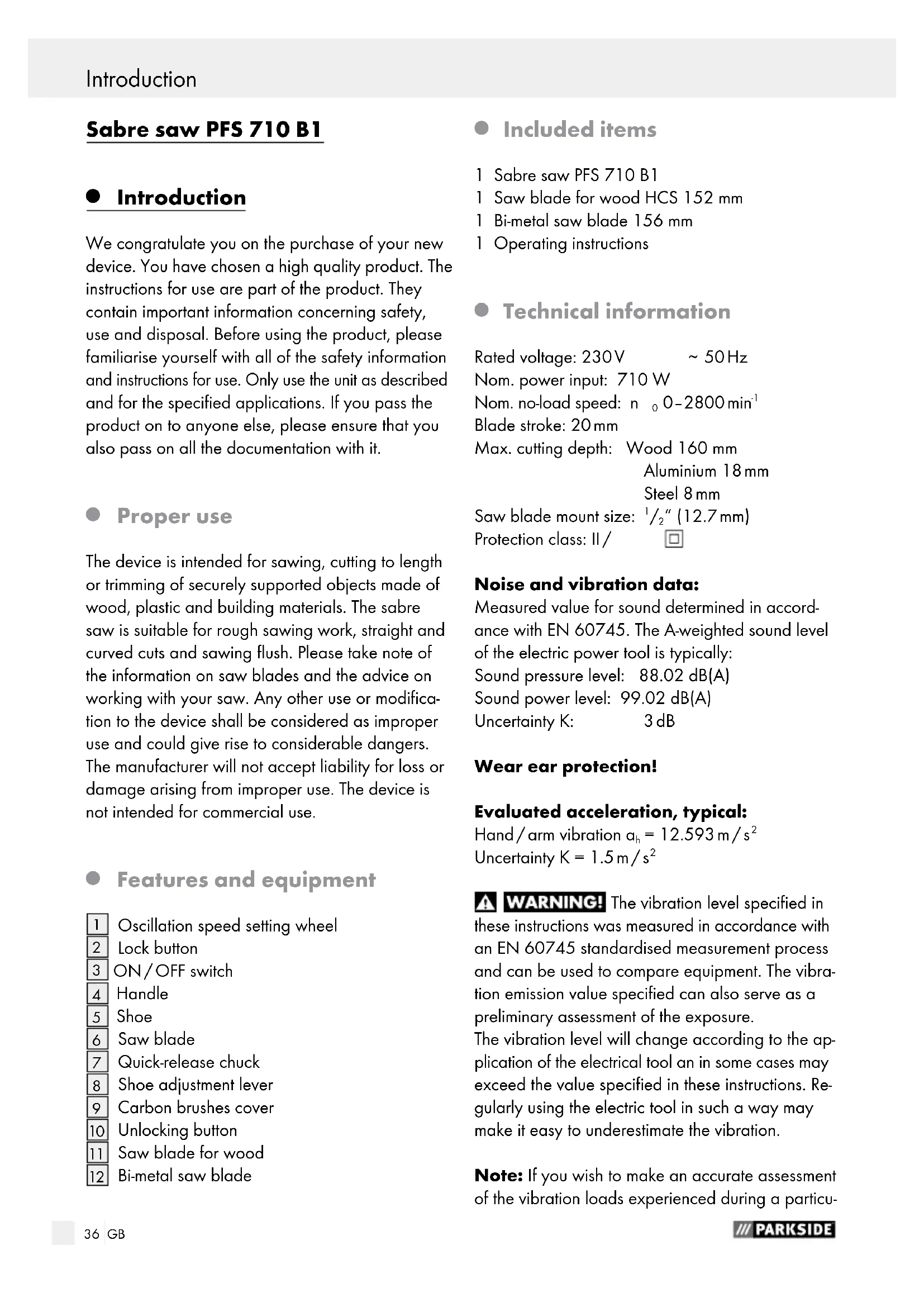 Included items 1 Sabre saw PFS 710 B1 1 Saw blade for wood HCS 152 mm 1 Bi-metal saw blade 156 mm 1 Operating instructions