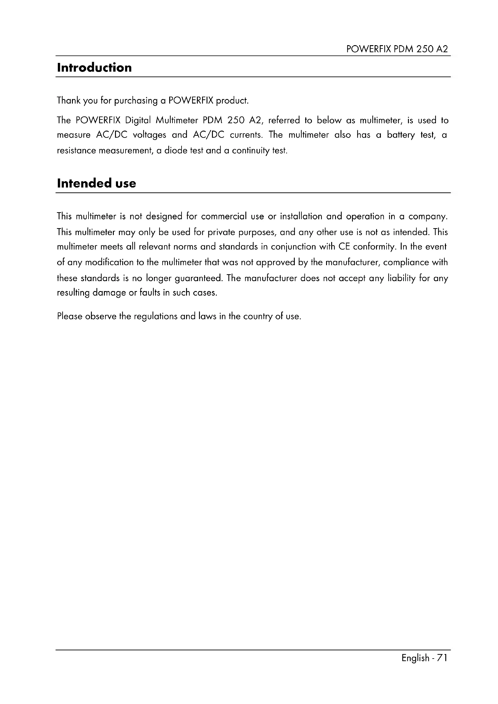 The POWERFIX Digital Multimeter PDM 250 A2, referred to below as multimeter, is used to measure AC/DC voltages and AC/DC currents. The multimeter also has a battery test, a resistance measurement, a diode test and a continuity test.