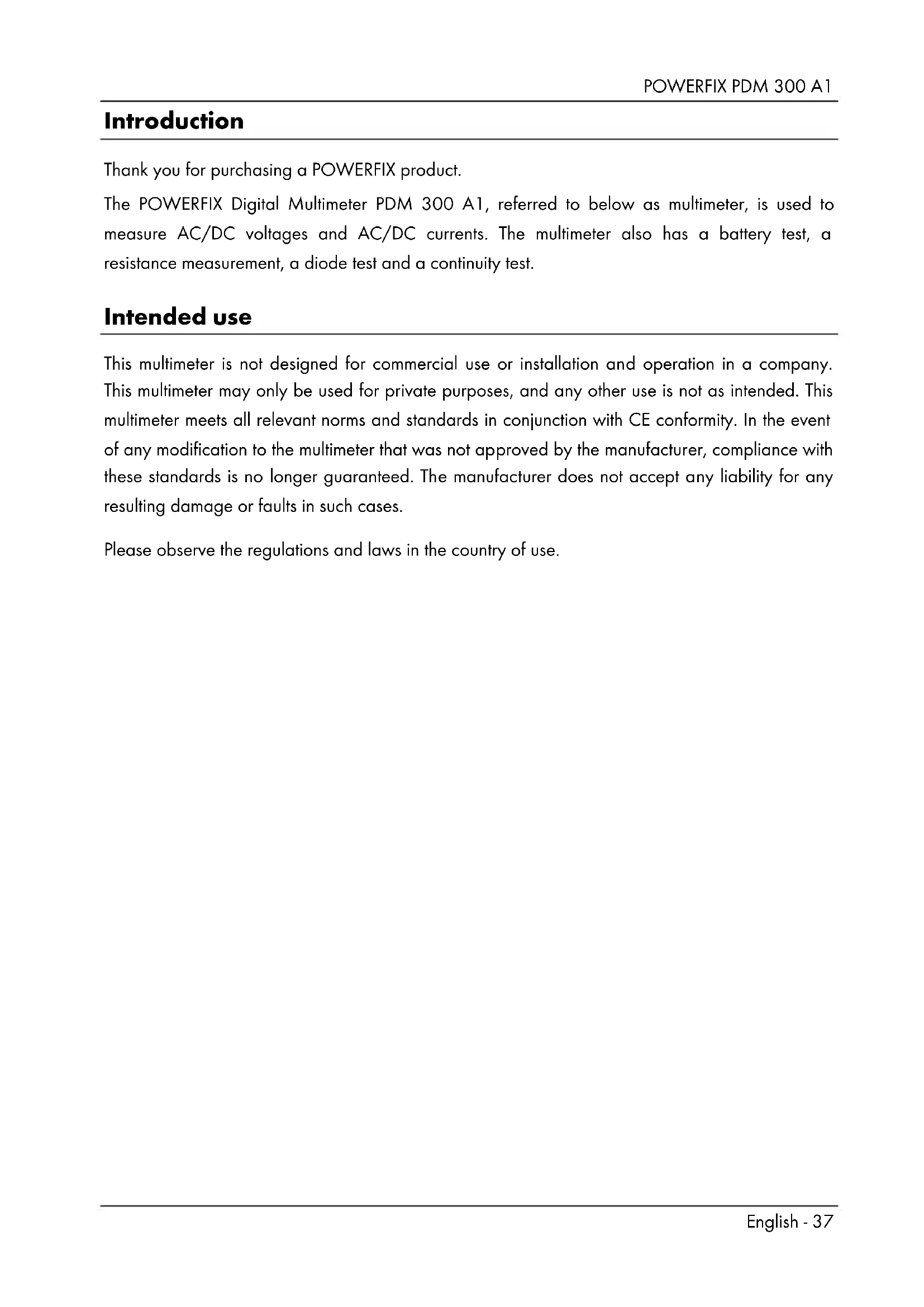 PDM 300 A1 - Multimeter POWERFIX - Free user manual and instructions