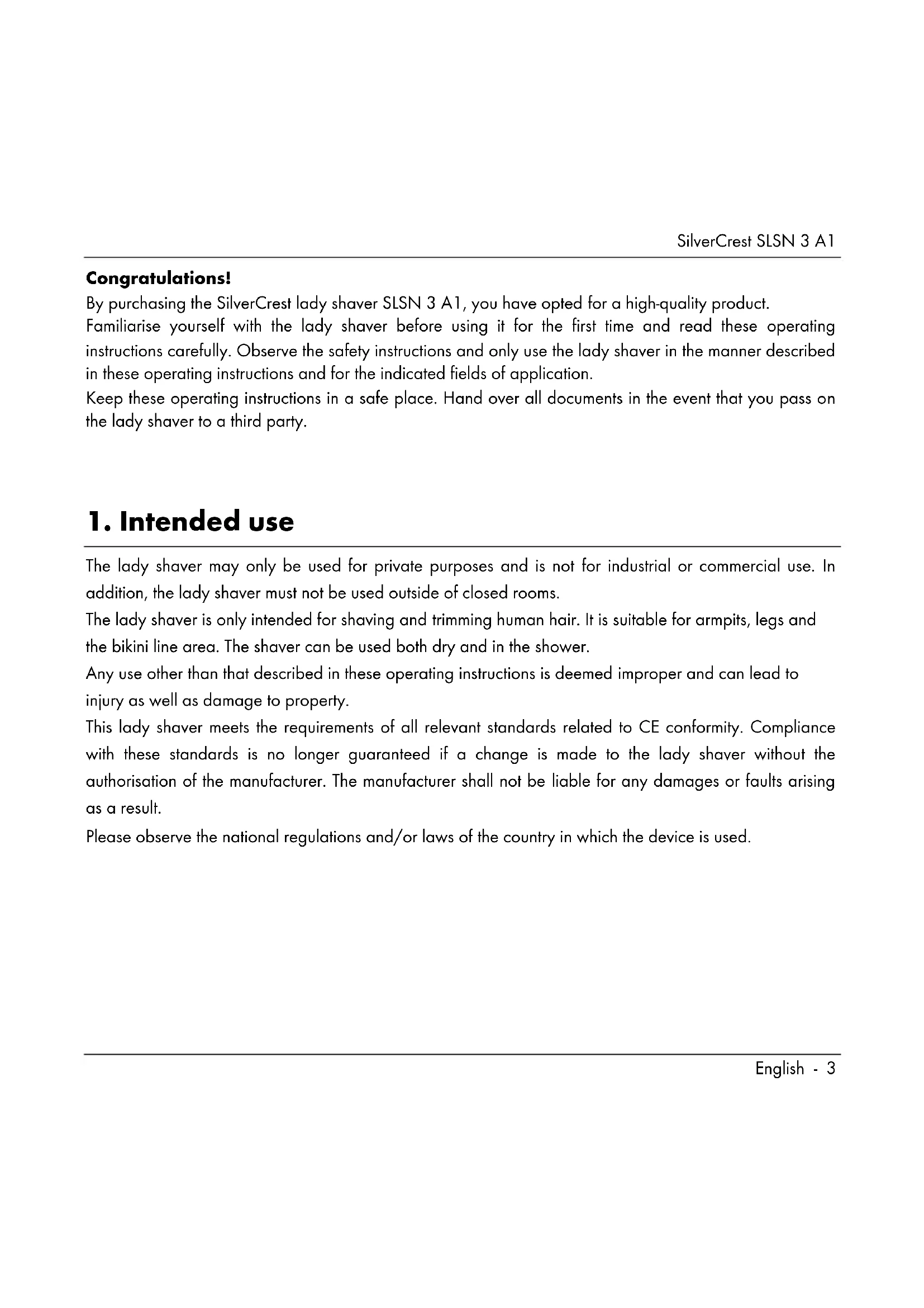 13. Notes on guarantee and service ......................................................................... 19SilverCrest SLSN 3 A1 English - 3 Congratulations! By purchasing the SilverCrest lady shaver SLSN 3 A1, you have opted for a high-quality product. Familiarise yourself with the lady shaver before using it for the first time and read these operating instructions carefully. Observe the safety instructions and only use the lady shaver in the manner described in these operating instructions and for the indicated fields of application. Keep these operating instructions in a safe place. Hand over all documents in the event that you pass on the lady shaver to a third party.