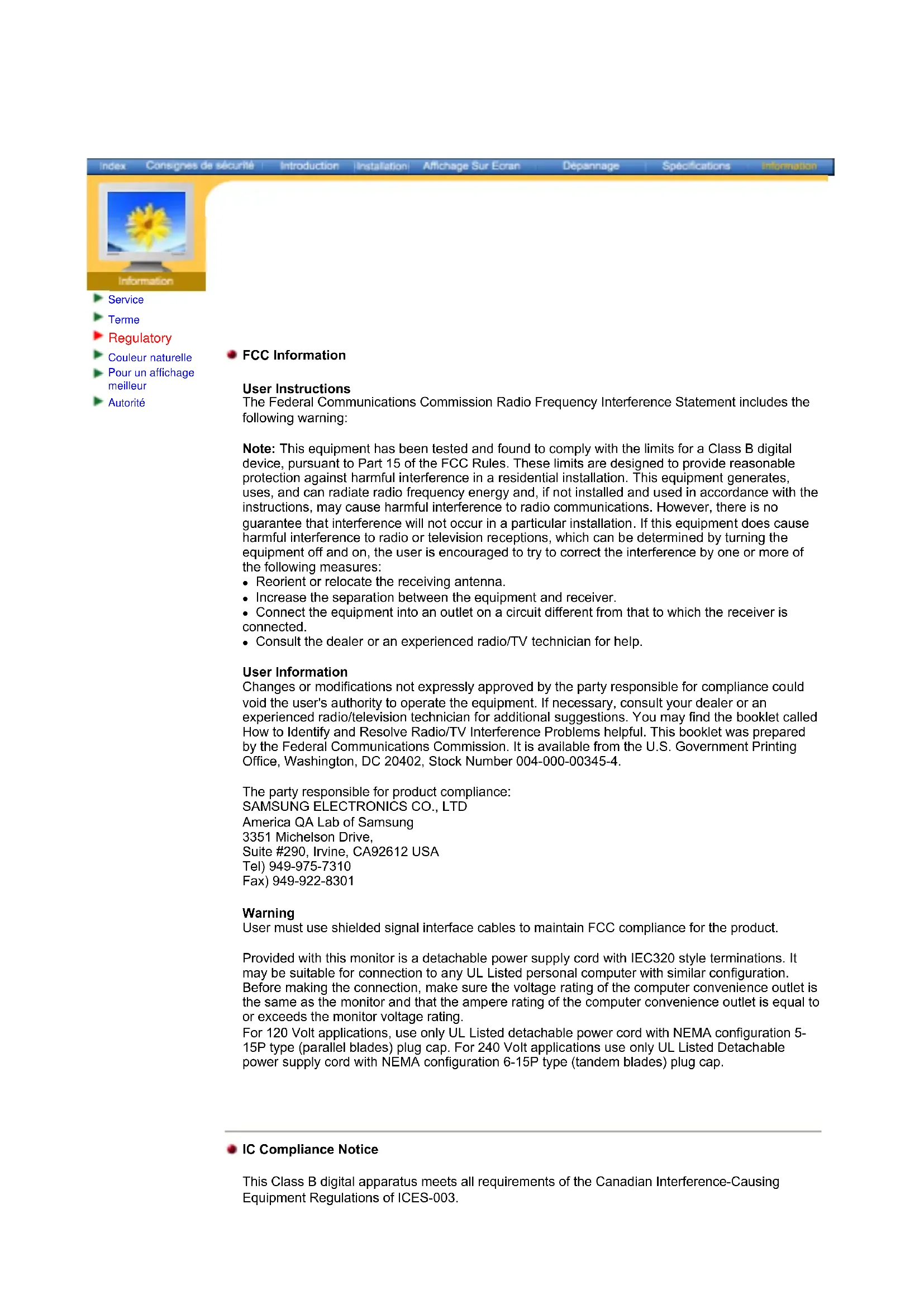 America QA Lab of Samsung 3351 Michelson Drive, Suite #290, Irvine, CA92612 USA Tel) 949-975-7310 Fax) 949-922-8301 Warning User must use shielded signal interface cables to maintain FCC compliance for the product. Provided with this monitor is a detachable power supply cord with IEC320 style terminations. It may be suitable for connection to any UL Listed personal computer with similar configuration. Before making the connection, make sure the voltage rating of the computer convenience outlet is the same as the monitor and that the ampere rating of the computer convenience outlet is equal to or exceeds the monitor voltage rating. For 120 Volt applications, use only UL Listed detachable power cord with NEMA configuration 5- 15P type (parallel blades) plug cap. For 240 Volt applications use only UL Listed Detachable power supply cord with NEMA configuration 6-15P type (tandem blades) plug cap. IC Compliance Notice This Class B digital apparatus meets all requirements of the Canadian Interference-Causing Equipment Regulations of ICES-003.Cet appareil Numérique de classe B respecte toutes les exigences du Règlemont NMB-03 sur les équipements produisant des interférences au Canada. MPR II Compliance This monitor complies with SWEDAC(MPR II) recommendations for reduced electric and magnetic fields. European Notice(Europe Only) Products with the CE marking comply with the EMC Directive(89/336/EEC), (92/31/EEC), (93/68/EEC) and the Low Voltage Directive (73/23/EEC) issued by the Commission of the European Community. Compliance with these directives implies conformity to the following European Norms: z EN55022:1998+A1:2000 - Radio Frequency Interference z EN55024:1998 - Electromagnetic Immunity of Information Technology Equipment z EN61000-3-2:1995+A1/A2:1998 - Power Line Harmonics z EN61000-3-3:1995 - Voltage Fluctuations PCT Notice