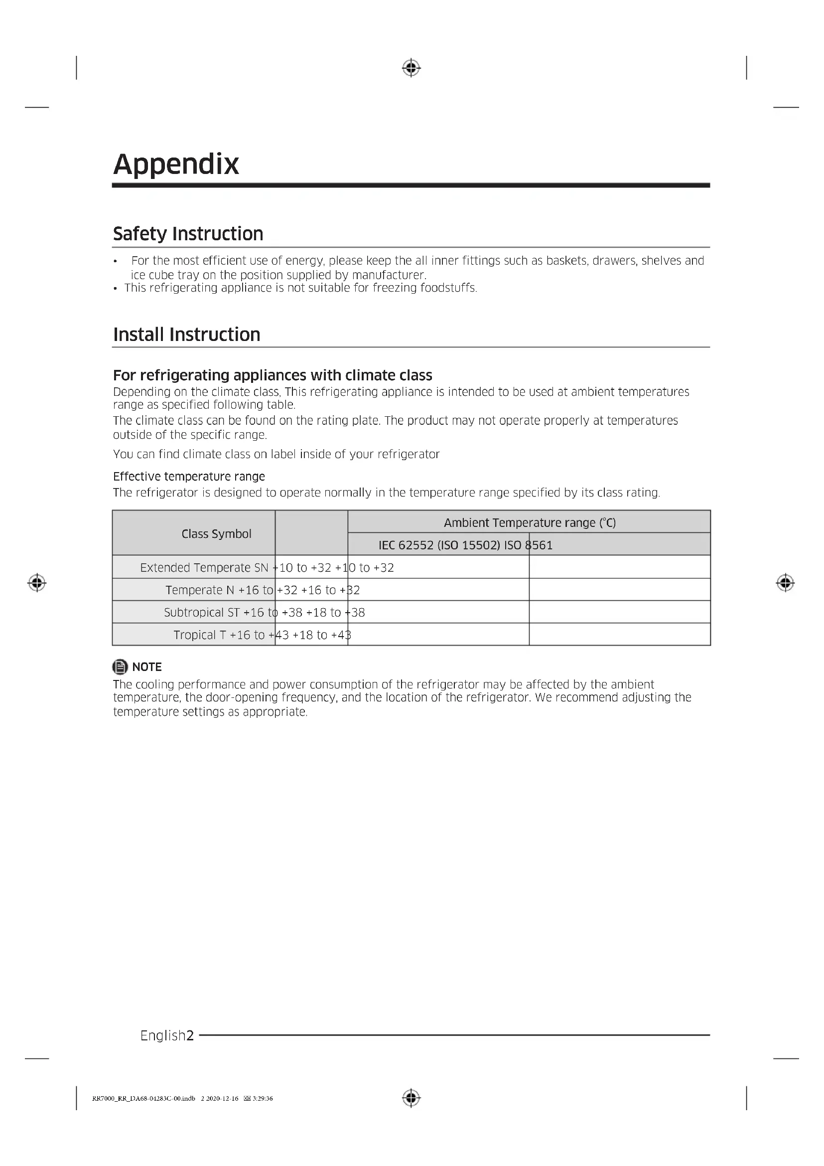 Extended Temperate SN +10 to +32 +10 to +32 Temperate N +16 to +32 +16 to +32 Subtropical ST +16 to +38 +18 to +38 Tropical T +16 to +43 +18 to +43 NOTE The cooling performance and power consumption of the refrigerator may be affected by the ambient temperature, the door-opening frequency, and the location of the refrigerator. We recommend adjusting the temperature settings as appropriate. RR7000_RR_DA68-04283C-00.indb 2 2020-12-16 3:29:36English 3 Temperature Instruction Recommended Temperature The optimal temperature setting for food storage: