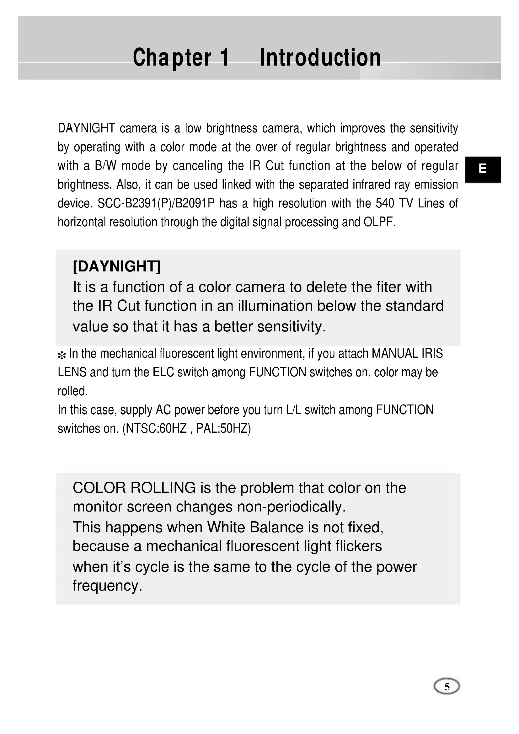 [DAYNIGHT] It is a function of a color camera to delete the fiter with the IR Cut function in an illumination below the standard value so that it has a better sensitivity. COLOR ROLLING is the problem that color on the monitor screen changes non-periodically. This happens when White Balance is not fixed, because a mechanical fluorescent light flickers when it’s cycle is the same to the cycle of the power frequency.6