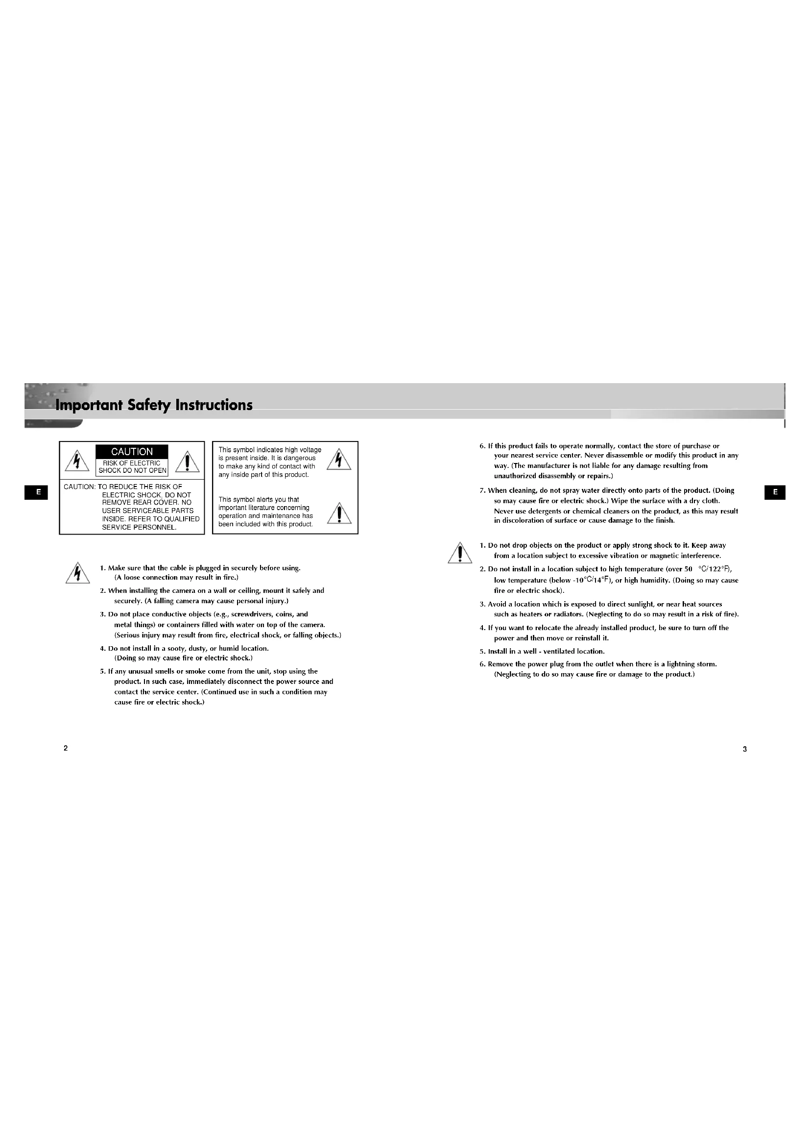 product. In such case, immediately disconnect the power source and contact the service center. (Continued use in such a condition may cause fire or electric shock.) This symbol indicates high voltageis present inside. It is dangerousto make any kind of contact withany inside part of this product.This symbol alerts you thatimportant literature concerningoperation and maintenance hasbeen included with this product. CAUTION RISK OF ELECTRIC SHOCK DO NOT OPEN 00351A SOC-920P-eng 11/19/03 3:15 PM Page 2E
