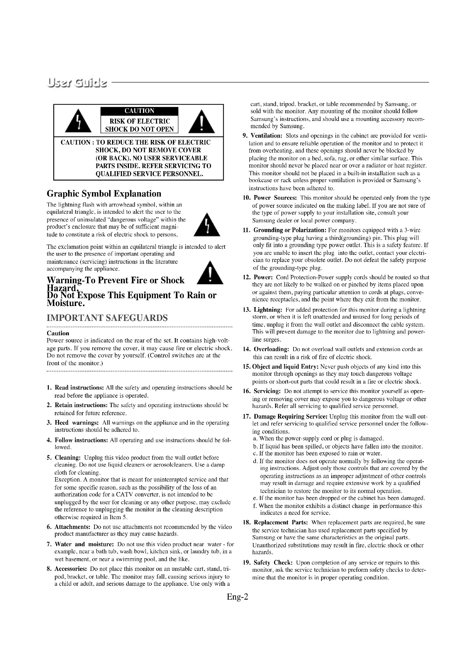 monitor, ask the service technician to preform safety checks to deter- mine that the monitor is in proper operating condition. Eng-2 CAUTION : TO REDUCE THE RISK OF ELECTRIC
