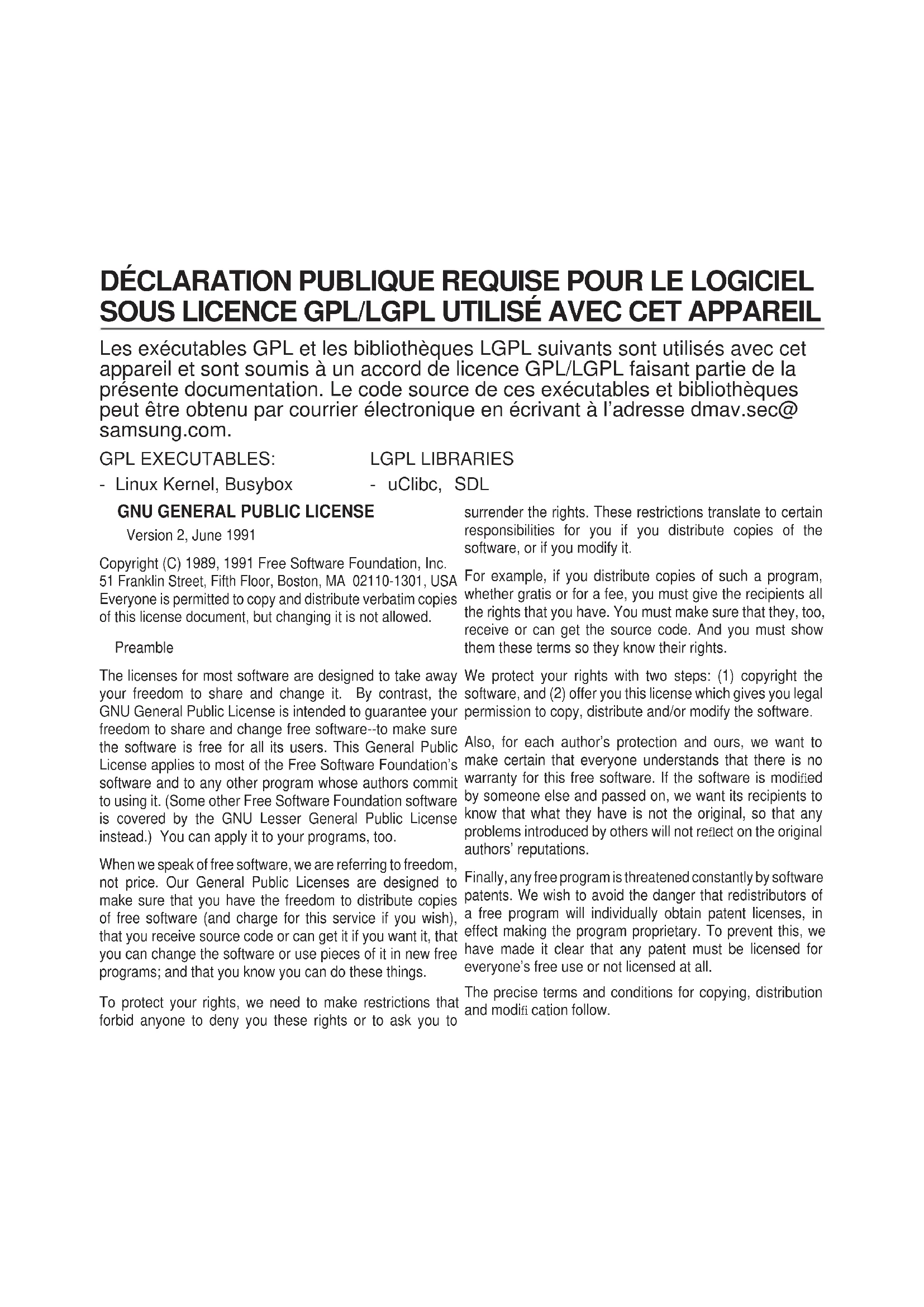 www.samsung.com Country Customer Care Center Web SiteGNU GENERAL PUBLIC LICENSE Version 2, June 1991 Copyright (C) 1989, 1991 Free Software Foundation, Inc. 51 Franklin Street, Fifth Floor, Boston, MA 02110-1301, USA Everyone is permitted to copy and distribute verbatim copies of this license document, but changing it is not allowed. Preamble The licenses for most software are designed to take away your freedom to share and change it. By contrast, the GNU General Public License is intended to guarantee your freedom to share and change free software--to make sure the software is free for all its users. This General Public License applies to most of the Free Software Foundation’s software and to any other program whose authors commit to using it. (Some other Free Software Foundation software is covered by the GNU Lesser General Public License instead.) You can apply it to your programs, too. When we speak of free software, we are referring to freedom, not price. Our General Public Licenses are designed to make sure that you have the freedom to distribute copies of free software (and charge for this service if you wish), that you receive source code or can get it if you want it, that you can change the software or use pieces of it in new free programs; and that you know you can do these things. To protect your rights, we need to make restrictions that forbid anyone to deny you these rights or to ask you to surrender the rights. These restrictions translate to certain responsibilities for you if you distribute copies of the software, or if you modify it. For example, if you distribute copies of such a program, whether gratis or for a fee, you must give the recipients all the rights that you have. You must make sure that they, too, receive or can get the source code. And you must show them these terms so they know their rights. We protect your rights with two steps: (1) copyright the software, and (2) offer you this license which gives you legal permission to copy, distribute and/or modify the software. Also, for each author’s protection and ours, we want to make certain that everyone understands that there is no warranty for this free software. If the software is modifi ed by someone else and passed on, we want its recipients to know that what they have is not the original, so that any problems introduced by others will not refl ect on the original authors’ reputations. Finally, any free program is threatened constantly by software patents. We wish to avoid the danger that redistributors of a free program will individually obtain patent licenses, in effect making the program proprietary. To prevent this, we have made it clear that any patent must be licensed for everyone’s free use or not licensed at all. The precise terms and conditions for copying, distribution and modifi cation follow. GPL EXECUTABLES: - Linux Kernel, Busybox LGPL LIBRARIES - uClibc, SDL DÉCLARATION PUBLIQUE REQUISE POUR LE LOGICIEL SOUS LICENCE GPL/LGPL UTILISÉ AVEC CET APPAREIL Les exécutables GPL et les bibliothèques LGPL suivants sont utilisés avec cet appareil et sont soumis à un accord de licence GPL/LGPL faisant partie de la présente documentation. Le code source de ces exécutables et bibliothèques peut être obtenu par courrier électronique en écrivant à l’adresse dmav.sec@ samsung.com.TERMS AND CONDITIONS FOR COPYING,