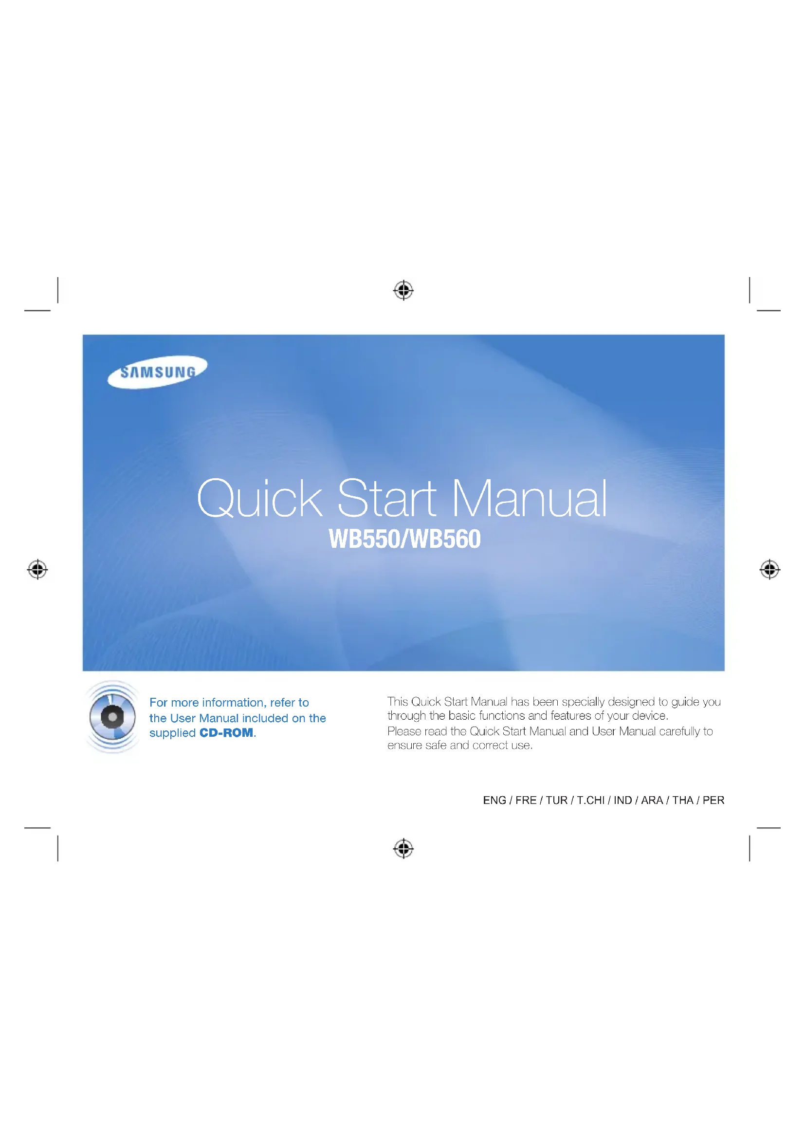 This Quick Start Manual has been specially designed to guide you through the basic functions and features of your device. Please read the Quick Start Manual and User Manual carefully to ensure safe and correct use. Quick Start Manual WB550/WB560 For more information, refer to the User Manual included on the supplied CD-ROM. ENG / FRE / TUR / T.CHI / IND / ARA / THA / PER32