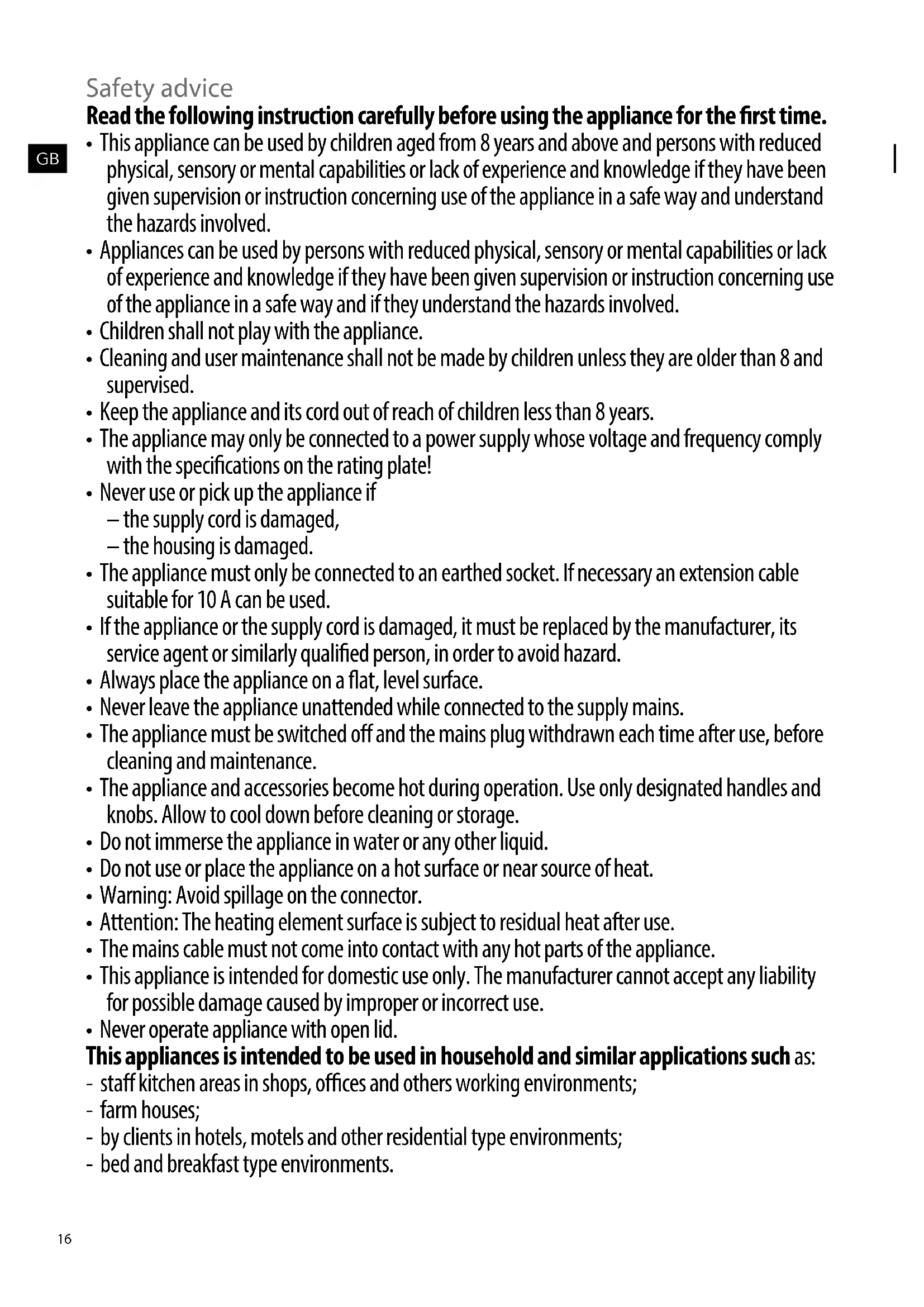 This appliance is intended for domestic use only. The manufacturer cannot accept any liability for possible damage caused by improper or incorrect use.