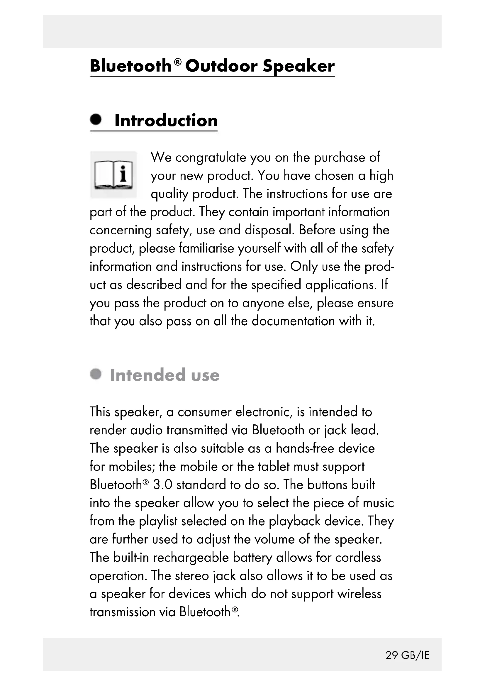 Outdoor Speaker Introduction We congratulate you on the purchase of your new product. You have chosen a high quality product. The instructions for use are part of the product. They contain important information concerning safety, use and disposal. Before using the product, please familiarise yourself with all of the safety information and instructions for use. Only use the prod- uct as described and for the specified applications. If you pass the product on to anyone else, please ensure that you also pass on all the documentation with it. Intended use This speaker, a consumer electronic, is intended to render audio transmitted via Bluetooth or jack lead. The speaker is also suitable as a hands-free device for mobiles; the mobile or the tablet must support Bluetooth