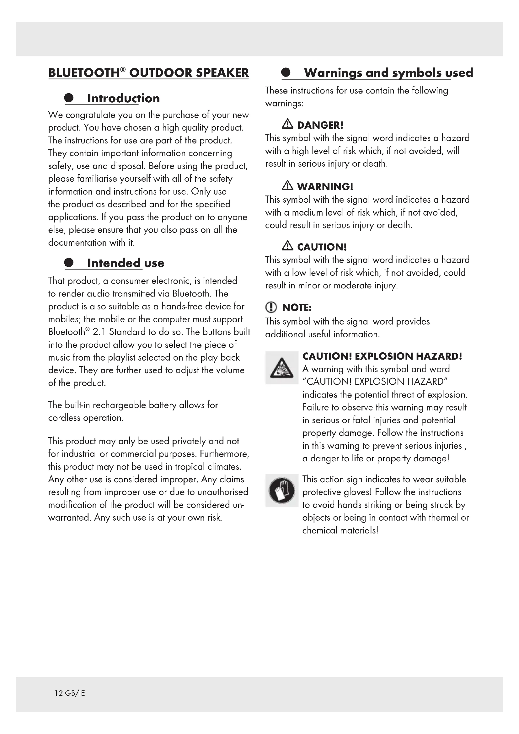 OUTDOOR SPEAKER Introduction We congratulate you on the purchase of your new product. You have chosen a high quality product. The instructions for use are part of the product. They contain important information concerning safety, use and disposal. Before using the product, please familiarise yourself with all of the safety information and instructions for use. Only use the product as described and for the specified applications. If you pass the product on to anyone else, please ensure that you also pass on all the documentation with it. Intended use That product, a consumer electronic, is intended to render audio transmitted via Bluetooth. The product is also suitable as a hands-free device for mobiles; the mobile or the computer must support Bluetooth