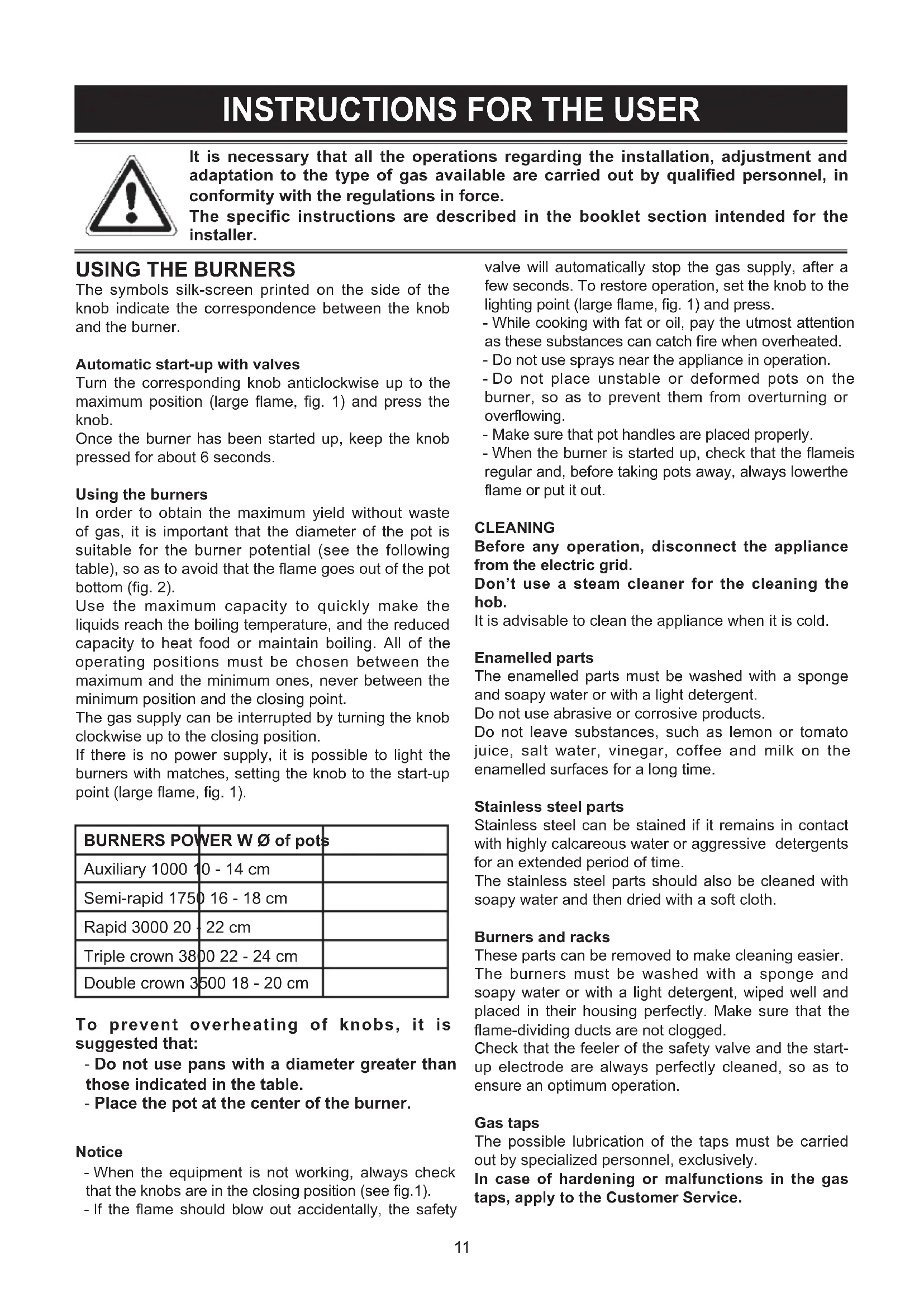 The symbols silk-screen printed on the side of the knob indicate the correspondence between the knob and the burner. Automatic start-up with valves Turn the corresponding knob anticlockwise up to the maximum position (large flame, fig. 1) and press the knob. Once the burner has been started up, keep the knob pressed for about 6 seconds. Using the burners In order to obtain the maximum yield without waste of gas, it is important that the diameter of the pot is suitable for the burner potential (see the following table), so as to avoid that the flame goes out of the pot bottom (fig. 2). Use the maximum capacity to quickly make the liquids reach the boiling temperature, and the reduced capacity to heat food or maintain boiling. All of the operating positions must be chosen between the maximum and the minimum ones, never between the minimum position and the closing point. The gas supply can be interrupted by turning the knob clockwise up to the closing position. If there is no power supply, it is possible to light the burners with matches, setting the knob to the start-up point (large flame, fig. 1). BURNERS POWER W Ø of pots Auxiliary 1000 10 - 14 cm Semi-rapid 1750 16 - 18 cm Rapid 3000 20 - 22 cm Triple crown 3800 22 - 24 cm Double crown 3500 18 - 20 cm To prevent overheating of knobs, it is suggested that: - Do not use pans with a diameter greater than those indicated in the table. - Place the pot at the center of the burner. Notice - When the equipment is not working, always check that the knobs are in the closing position (see fig.1). - If the flame should blow out accidentally, the safety valve will automatically stop the gas supply, after a few seconds. To restore operation, set the knob to the lighting point (large flame, fig. 1) and press. - While cooking with fat or oil, pay the utmost attention as these substances can catch fire when overheated. - Do not use sprays near the appliance in operation. - Do not place unstable or deformed pots on the burner, so as to prevent them from overturning or overflowing. - Make sure that pot handles are placed properly. - When the burner is started up, check that the flameis regular and, before taking pots away, always lowerthe flame or put it out. CLEANING Before any operation, disconnect the appliance from the electric grid. Don’t use a steam cleaner for the cleaning the hob. It is advisable to clean the appliance when it is cold. Enamelled parts The enamelled parts must be washed with a sponge and soapy water or with a light detergent. Do not use abrasive or corrosive products. Do not leave substances, such as lemon or tomato juice, salt water, vinegar, coffee and milk on the enamelled surfaces for a long time. Stainless steel parts Stainless steel can be stained if it remains in contact with highly calcareous water or aggressive detergents for an extended period of time. The stainless steel parts should also be cleaned with soapy water and then dried with a soft cloth. Burners and racks These parts can be removed to make cleaning easier. The burners must be washed with a sponge and soapy water or with a light detergent, wiped well and placed in their housing perfectly. Make sure that the ame-dividing ducts are not clogged. Check that the feeler of the safety valve and the start- up electrode are always perfectly cleaned, so as to ensure an optimum operation. Gas taps The possible lubrication of the taps must be carried out by specialized personnel, exclusively. In case of hardening or malfunctions in the gas taps, apply to the Customer Service.12