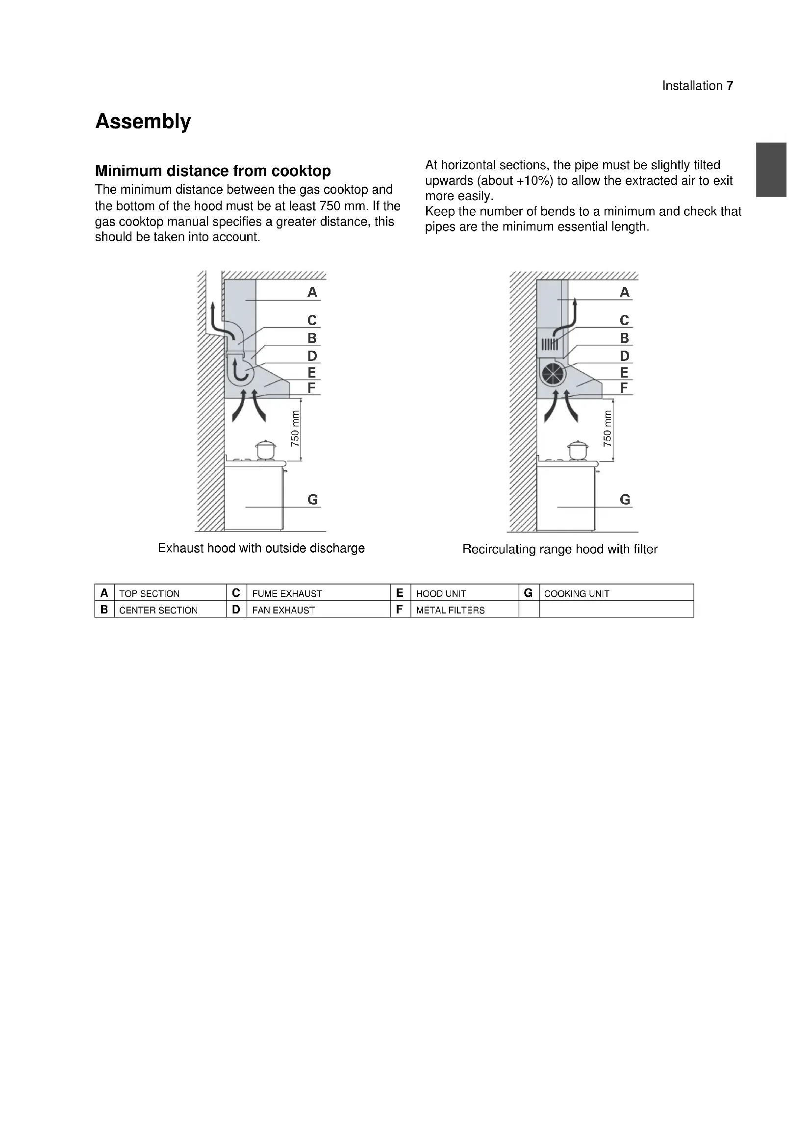 700 / 900 / 1000 / 1200 Type K Type GK Type AK Type AKLInstallation 7 Assembly Minimum distance from cooktop The minimum distance between the gas cooktop and the bottom of the hood must be at least 750 mm. If the gas cooktop manual specifies a greater distance, this should be taken into account. At horizontal sections, the pipe must be slightly tilted upwards (about +10%) to allow the extracted air to exit more easily. Keep the number of bends to a minimum and check that pipes are the minimum essential length.