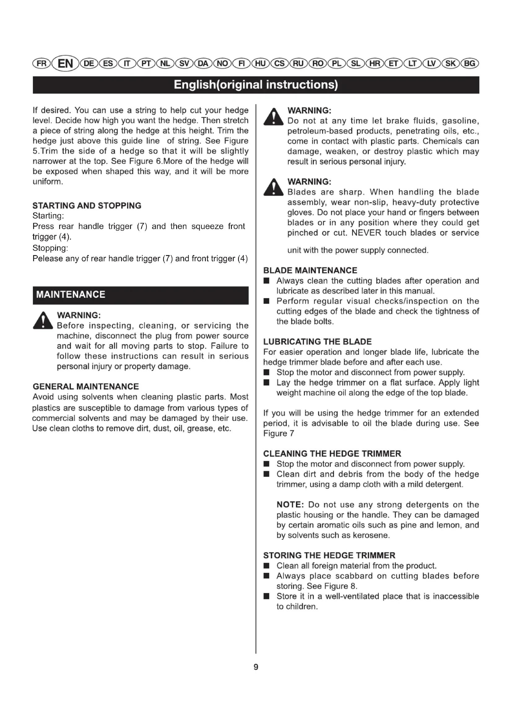 Name: Changzhou Globe Tools Co., Ltd. Address: No.65 Xinggang Road Zhonglou Zone Changzhou, Jiangsu 213000 P.R.China Name and address of the person authorised to compile the technical file: Name: Dennis Jacobson (Director of Outdoor Power Equipment) Address: Herewith we declare that the product Category ....................................................................................................... Hedge Trimmer Model ................................................................................................................. 22077/22247 Serial number ................................................................................... See product rating label Year of Construction ......................................................................... See product rating label E is in conformity with the relevant provisions of the Machinery Directive (2006/42/EC) E is in conformity with the provisions of the following other EC-Directives 2004/108/EC (EMC-Directive), and 2000/14/EC (Noise Directive) incl. modifications (2005/88/EC) And furthermore, we declare that E the following (parts/clauses of) European harmonised standards have been used EN 60745-1, EN 60745-2-15,EN ISO 3744, ISO 11094 EN55014-1:, EN55014-2, EN61000-3-3; EN61000-3-2 EN 60745-1, EN 60745-2-15,EN ISO 3744, ISO 11094 EN55014-1:, EN55014-2, EN61000-3-3; EN61000-3-2 Measured sound power level L