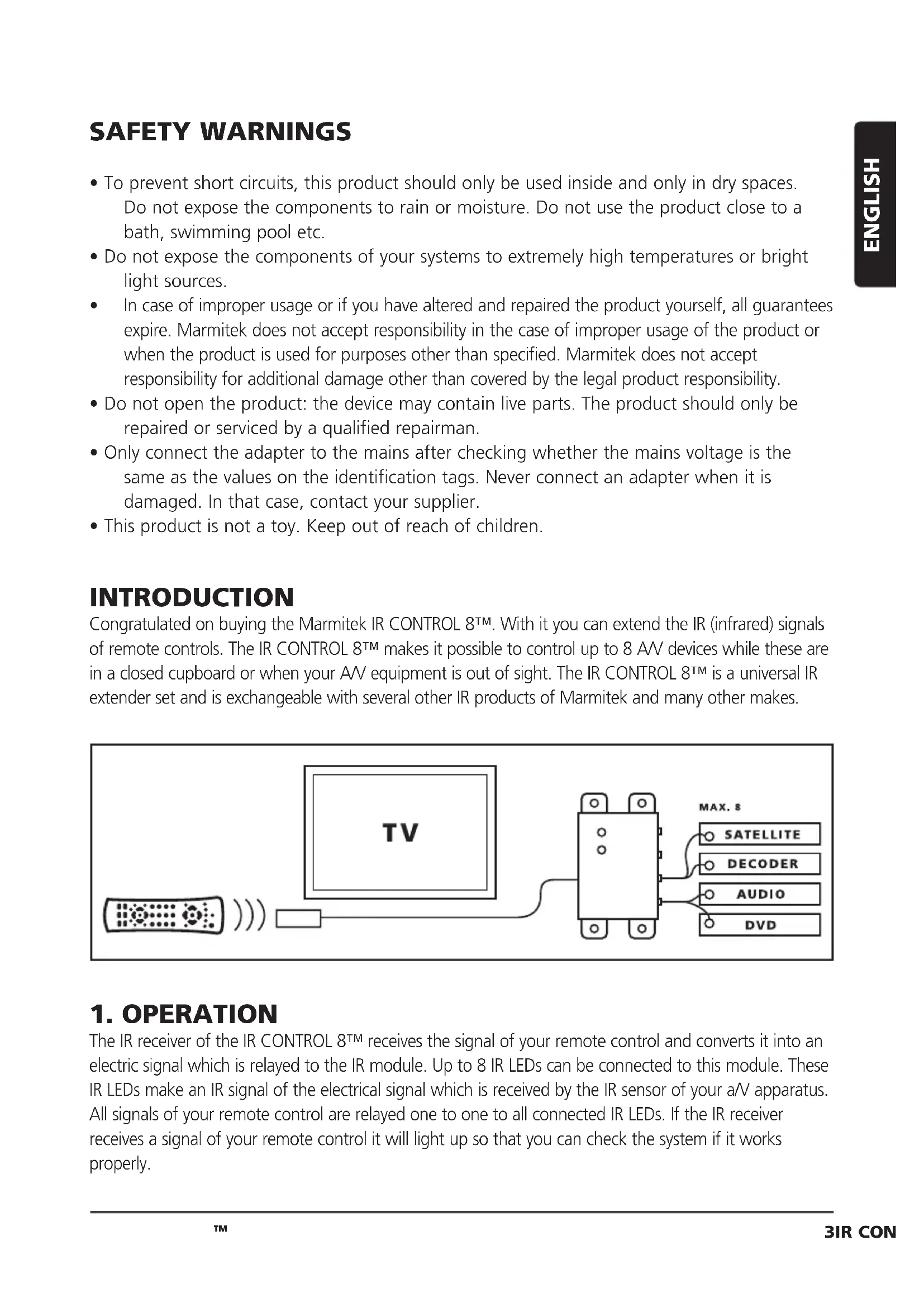 - This product is not a toy. Keep out of reach of children. INTRODUCTION Congratulated on buying the Marmitek IR CONTROL 8™. With it you can extend the IR (infrared) signals of remote controls. The IR CONTROL 8™ makes it possible to control up to 8 A/V devices while these are in a closed cupboard or when your A/V equipment is out of sight. The IR CONTROL 8™ is a universal IR extender set and is exchangeable with several other IR products of Marmitek and many other makes.