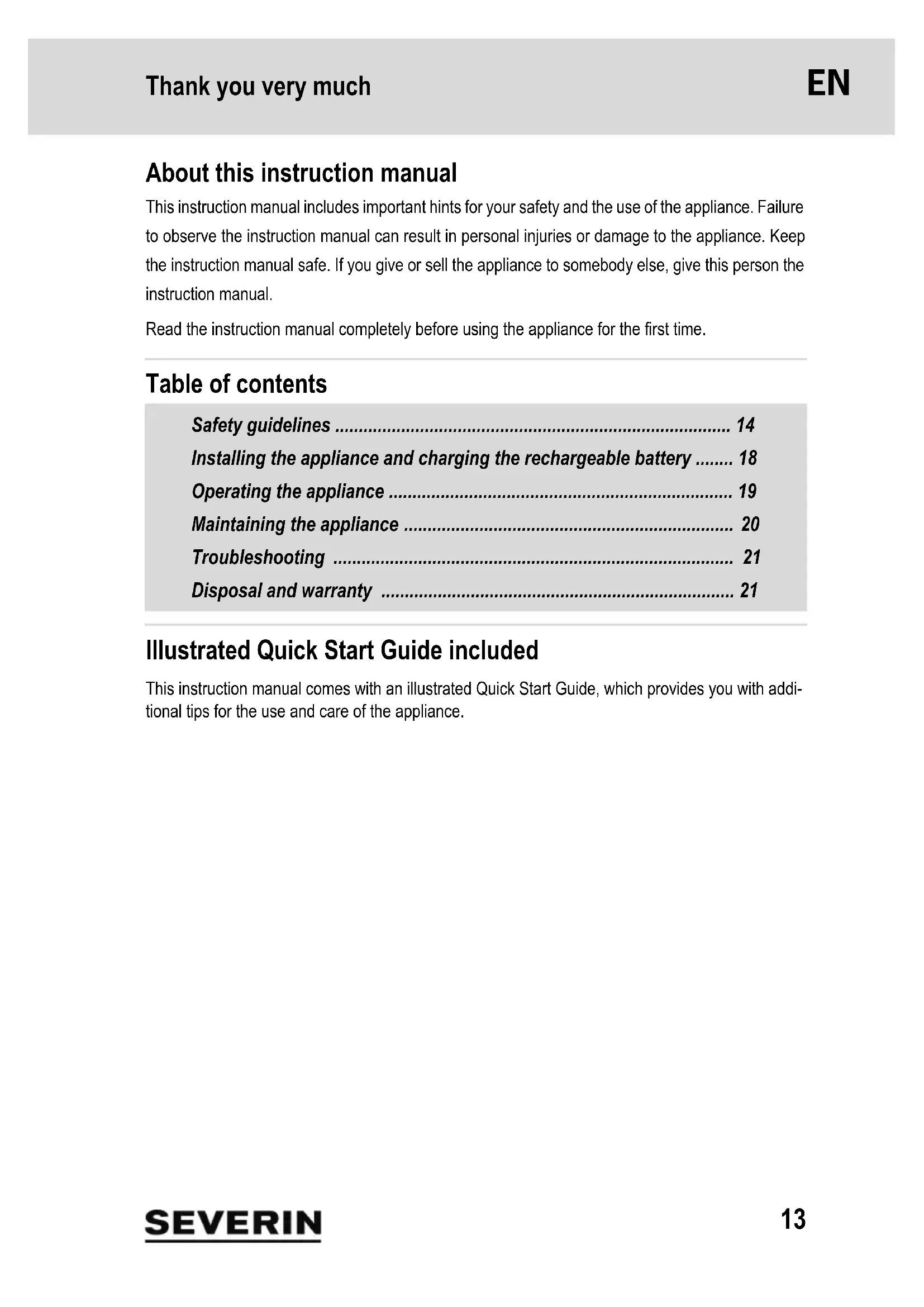 - Gerät und Akku separat entsorgen Geräte und Akkus, die mit diesem Symbol gekennzeichnet sind, müssen getrennt vom Hausmüll entsorgt werden! Geräte und Akkus enthalten wertvolle Rohstoffe, die wiederverwertet werden können. Eine ordnungsgemäße Entsorgung schützt die Umwelt und die Gesundheit Ihrer Mitmenschen. Gerät und den ausgebauten Akku separat zur Entsorgung an die entsprechenden Sammelstellen geben. Garantie Von den nachfolgenden Garantiebedingungen bleiben die gesetzlichen Gewährleistungsrechte ge- genüber dem Verkäufer und eventuelle Verkäufergarantien unberührt. Sollte eine Reparatur erforderlich werden, setzen Sie sich telefonisch oder per Mail mit un- serem Kundendienst in Verbindung. Die Kontaktdaten finden Sie im Anhang dieser Ge- brauchsanleitung. Wenden Sie sich im Garantiefall alternativ auch direkt an den Händler. Zusätz- lich gewährt SEVERIN eine Herstellergarantie von zwei Jahren ab Kaufdatum. In diesem Zeitraum beseitigen wir kostenlos alle Mängel, die nachweislich auf Material- oder Fertigungsfehlern beru- hen und die Funktion wesentlich beeinträchtigen. Weitere Ansprüche sind ausgeschlossen. Von der Garantie ausgenommen sind: Schäden, die auf Nichtbeachtung der Gebrauchsanleitung, unsachgemäße Behandlung oder normalen Verschleiß zurückzuführen sind, ebenso leicht zer- brechliche Teile wie z. B. Glas, Kunststoff oder LEDs. Von der Garantie ausgenommen sind außer- dem Batterien und Akkus, die infolge normalen Verschleißes oder unsachgemäßer Handhabung defekt geworden sind bzw. deren Laufzeit sich verkürzt hat. Die Garantie erlischt bei Eingriff nicht von SEVERIN autorisierter Stellen.13 Thank you very much 1 Thank you very much About this instruction manual This instruction manual includes important hints for your safety and the use of the appliance. Failure to observe the instruction manual can result in personal injuries or damage to the appliance. Keep the instruction manual safe. If you give or sell the appliance to somebody else, give this person the instruction manual. Read the instruction manual completely before using the appliance for the first time. Table of contents Safety guidelines p. 14