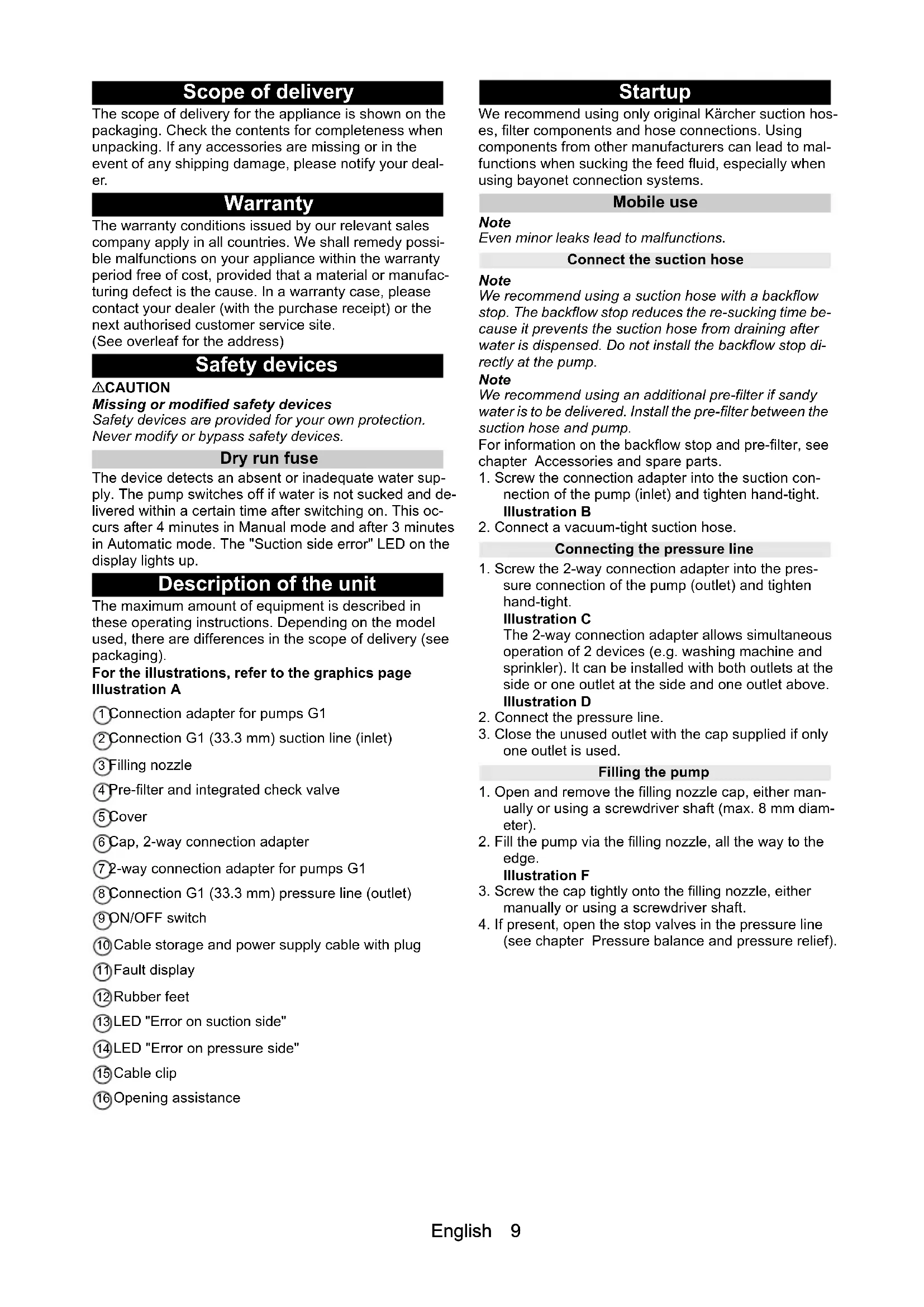 - EU Declaration of Conformity Chairman of the Board of Management Director Regulatory Affairs & CertificationEnglish 9 Scope of delivery The scope of delivery for the appliance is shown on the packaging. Check the contents for completeness when unpacking. If any accessories are missing or in the event of any shipping damage, please notify your deal- er. Warranty The warranty conditions issued by our relevant sales company apply in all countries. We shall remedy possi- ble malfunctions on your appliance within the warranty period free of cost, provided that a material or manufac- turing defect is the cause. In a warranty case, please contact your dealer (with the purchase receipt) or the next authorised customer service site. (See overleaf for the address) Safety devices 몇 CAUTION Missing or modified safety devices Safety devices are provided for your own protection. Never modify or bypass safety devices. Dry run fuse The device detects an absent or inadequate water sup- ply. The pump switches off if water is not sucked and de- livered within a certain time after switching on. This oc- curs after 4 minutes in Manual mode and after 3 minutes in Automatic mode. The "Suction side error" LED on the display lights up. Description of the unit The maximum amount of equipment is described in these operating instructions. Depending on the model used, there are differences in the scope of delivery (see packaging). For the illustrations, refer to the graphics page Illustration A 1 Connection adapter for pumps G1 2 Connection G1 (33.3 mm) suction line (inlet) 3 Filling nozzle 4 Pre-filter and integrated check valve 5 Cover 6 Cap, 2-way connection adapter 7 2-way connection adapter for pumps G1 8 Connection G1 (33.3 mm) pressure line (outlet) 9 ON/OFF switch 10 Cable storage and power supply cable with plug 11 Fault display 12 Rubber feet 13 LED "Error on suction side" 14 LED "Error on pressure side" 15 Cable clip 16 Opening assistance Startup We recommend using only original Kärcher suction hos- es, filter components and hose connections. Using components from other manufacturers can lead to mal- functions when sucking the feed fluid, especially when using bayonet connection systems. Mobile use Note Even minor leaks lead to malfunctions. Connect the suction hose Note We recommend using a suction hose with a backflow stop. The backflow stop reduces the re-sucking time be- cause it prevents the suction hose from draining after water is dispensed. Do not install the backflow stop di- rectly at the pump. Note We recommend using an additional pre-filter if sandy water is to be delivered. Install the pre-filter between the suction hose and pump. For information on the backflow stop and pre-filter, see chapter Accessories and spare parts. p. 13