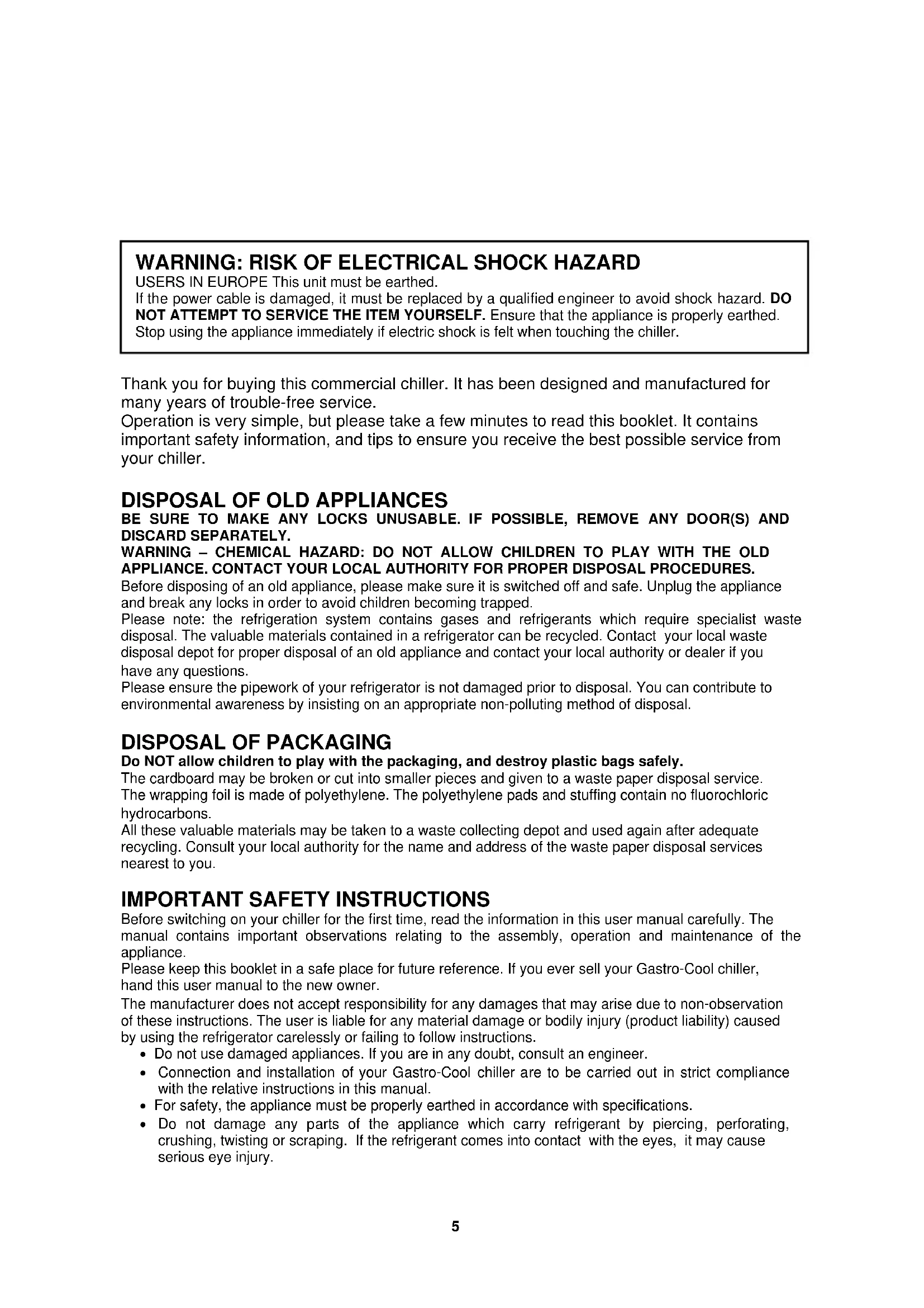 Before switching on your chiller for the first time, read the information in this user manual carefully. The manual contains important observations relating to the assembly, operation and maintenance of the appliance. Please keep this booklet in a safe place for future reference. If you ever sell your Gastro-Cool chiller, hand this user manual to the new owner. The manufacturer does not accept responsibility for any damages that may arise due to non-observation of these instructions. The user is liable for any material damage or bodily injury (product liability) caused by using the refrigerator carelessly or failing to follow instructions.