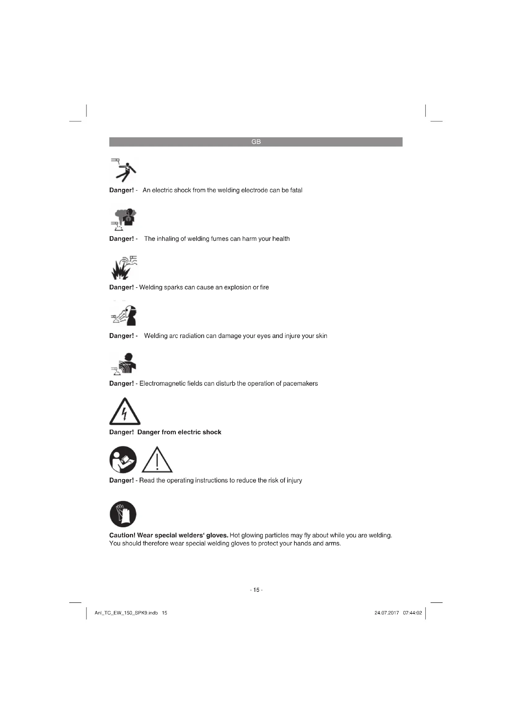 Danger! - An electric shock from the welding electrode can be fatal Danger! - The inhaling of welding fumes can harm your health Danger! - Welding arc radiation can damage your eyes and injure your skin Danger! - Welding sparks can cause an explosion or fi re Danger! - Electromagnetic fi elds can disturb the operation of pacemakers Danger! Danger from electric shock Danger! - Read the operating instructions to reduce the risk of injury Caution! Wear special welders‘ gloves. Hot glowing particles may fl y about while you are welding. You should therefore wear special welding gloves to protect your hands and arms. Anl_TC_EW_150_SPK9.indb 15Anl_TC_EW_150_SPK9.indb 15 24.07.2017 07:44:0224.07.2017 07:44:02GB
