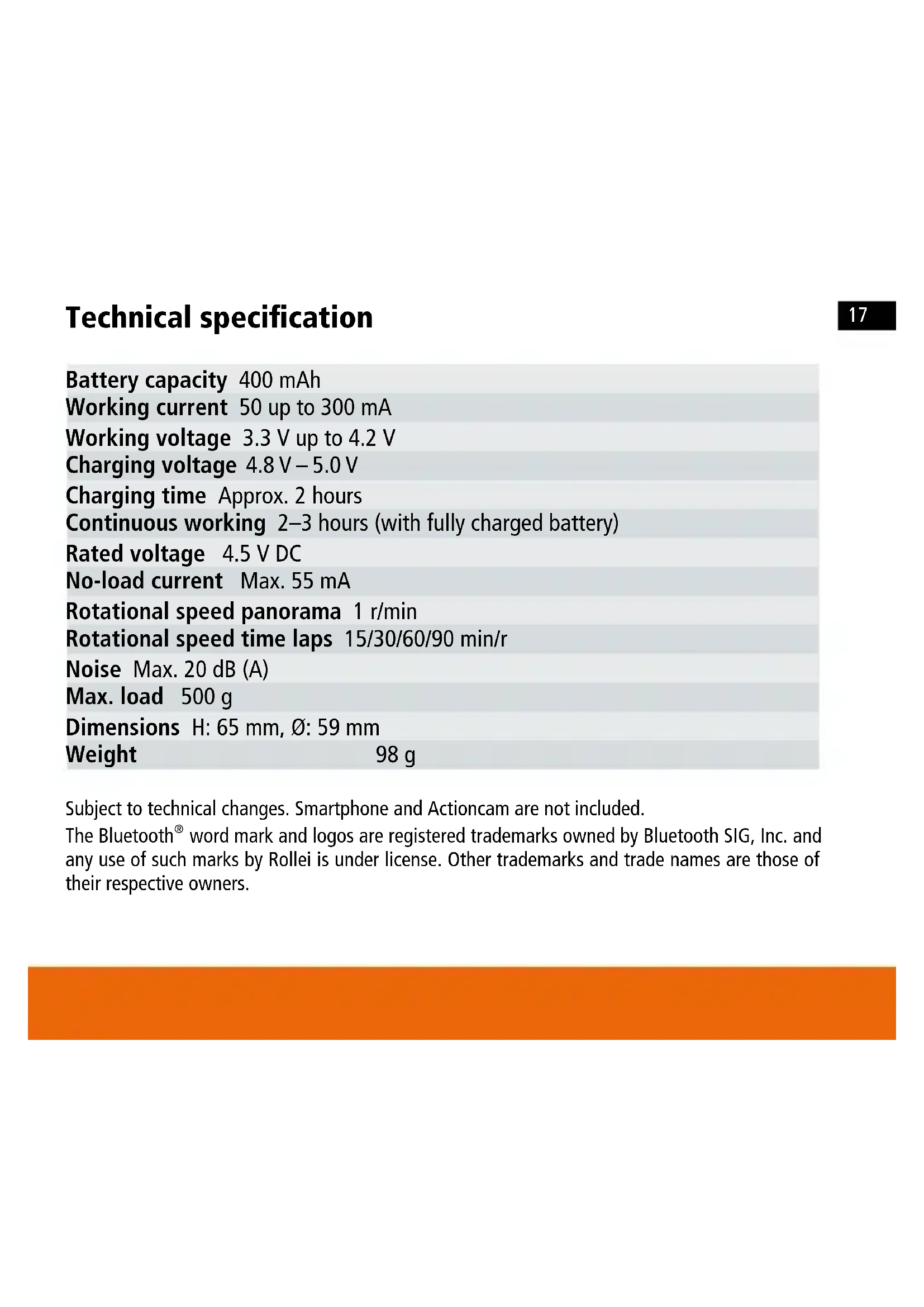 Technical specification Battery capacity 400 mAh Working current 50 up to 300 mA Working voltage 3.3 V up to 4.2 V Charging voltage 4.8 V – 5.0 V Charging time Approx. 2 hours Continuous working 2–3 hours (with fully charged battery) Rated voltage 4.5 V DC No-load current Max. 55 mA Rotational speed panorama 1 r/min Rotational speed time laps 15/30/60/90 min/r Noise Max. 20 dB (A) Max. load 500 g Dimensions H: 65 mm, Ø: 59 mm Weight 98 g Subject to technical changes. Smartphone and Actioncam are not included. The Bluetooth
