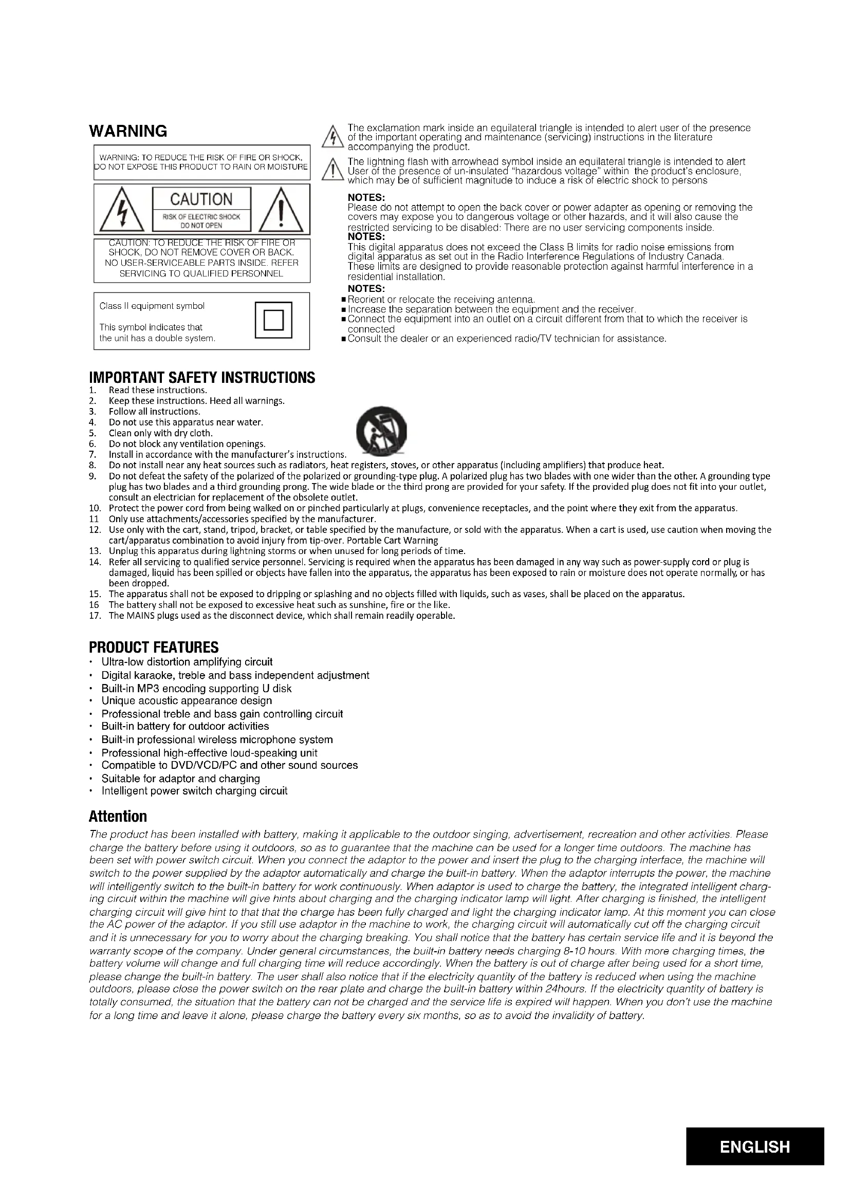 The product has been installed with battery, making it applicable to the outdoor singing, advertisement, recreation and other activities. Please charge the battery before using it outdoors, so as to guarantee that the machine can be used for a longer time outdoors. The machine has been set with power switch circuit. When you connect the adaptor to the power and insert the plug to the charging interface, the machine will switch to the power supplied by the adaptor automatically and charge the built-in battery. When the adaptor interrupts the power, the machine will intelligently switch to the built-in battery for work continuously. When adaptor is used to charge the battery, the integrated intelligent charging circuit within the machine will give hints about charging and the charging indicator lamp will light. After charging is finished, the intelligent charging circuit will give hint to that that the charge has been fully charged and light the charging indicator lamp. At this moment you can close the AC power of the adaptor. If you still use adaptor in the machine to work, the charging circuit will automatically cut off the charging circuit and it is unnecessary for you to worry about the charging breaking. You shall notice that the battery has certain service life and it is beyond the warranty scope of the company. Under general circumstances, the built-in battery needs charging 8-10 hours. With more charging times, the battery volume will change and full charging time will reduce accordingly. When the battery is out of charge after being used for a short time, please change the built-in battery. The user shall also notice that if the electricity quantity of the battery is reduced when using the machine outdoors, please close the power switch on the rear plate and charge the built-in battery within 24hours. If the electricity quantity of battery is totally consumed, the situation that the battery can not be charged and the service life is expired will happen. When you don't use the machine for a long time and leave it alone, please charge the battery every six months, so as to avoid the invalidity of battery.