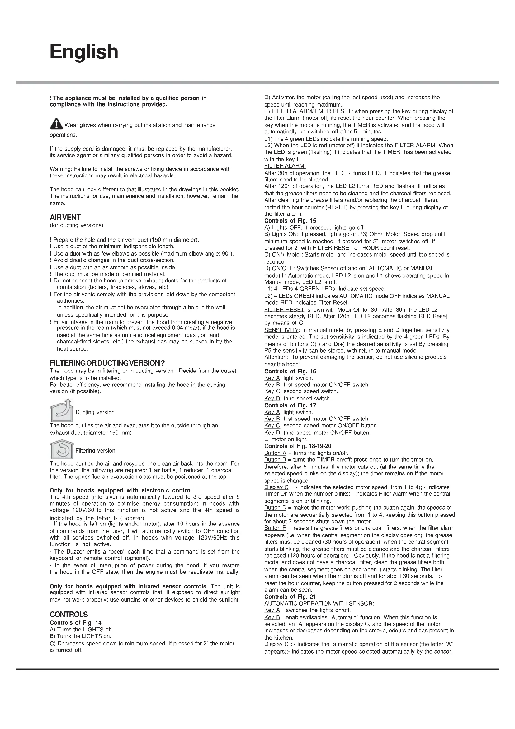 Work Time Limit: if the hood is left on (lights and/or motor), after 10 hours in the absence of commands from the user, it will automatically switch to OFF condition with all services switched off.