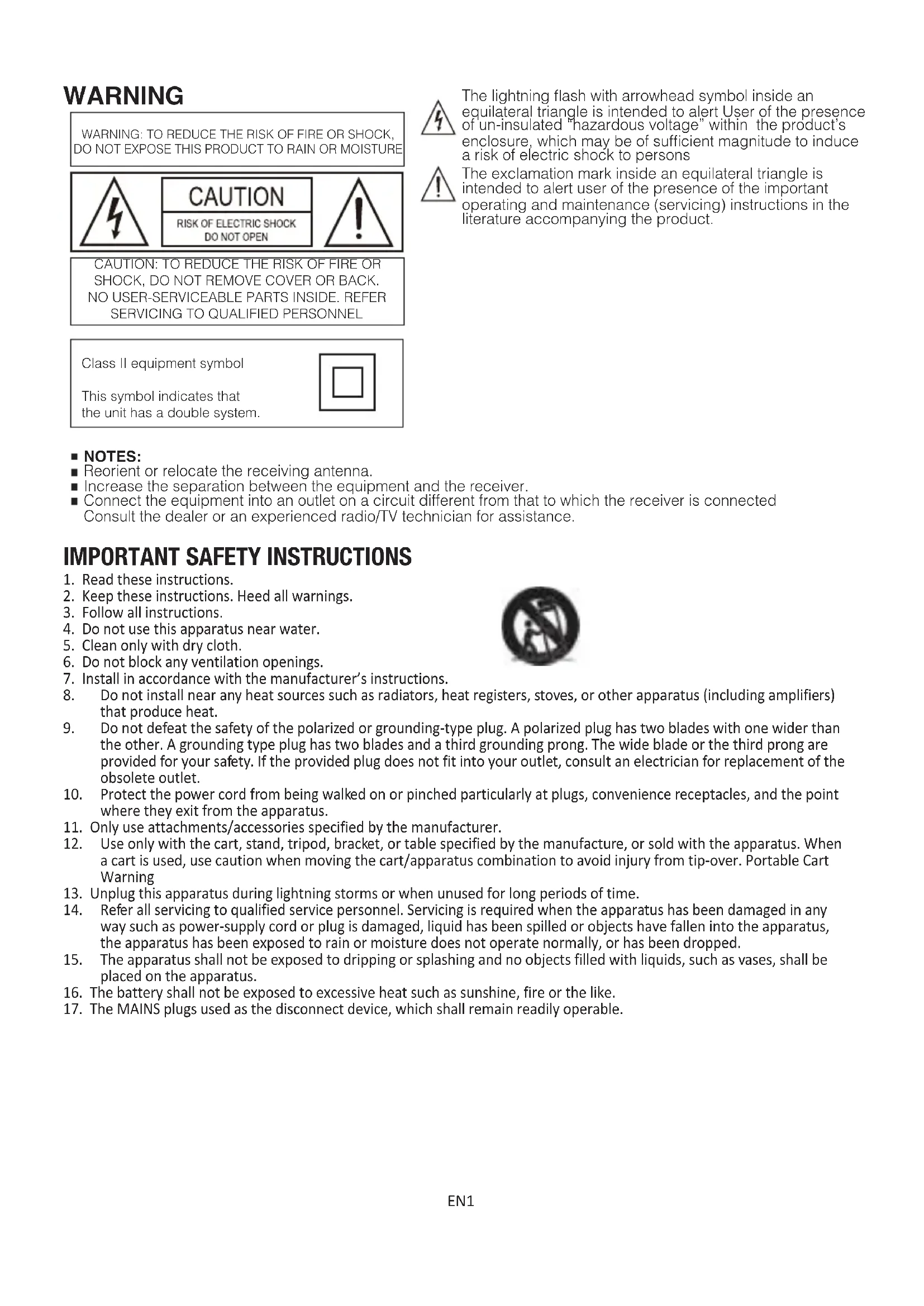 CAUTION: TO REDUCE THE RISK OF FIRE OR SHOCK,DO NOT REMOVE COVER OR BACK. NO USER-SERVICEABLE PARTS INSIDE.REFER SERVICING TO QUALIFIED PERSONNEL