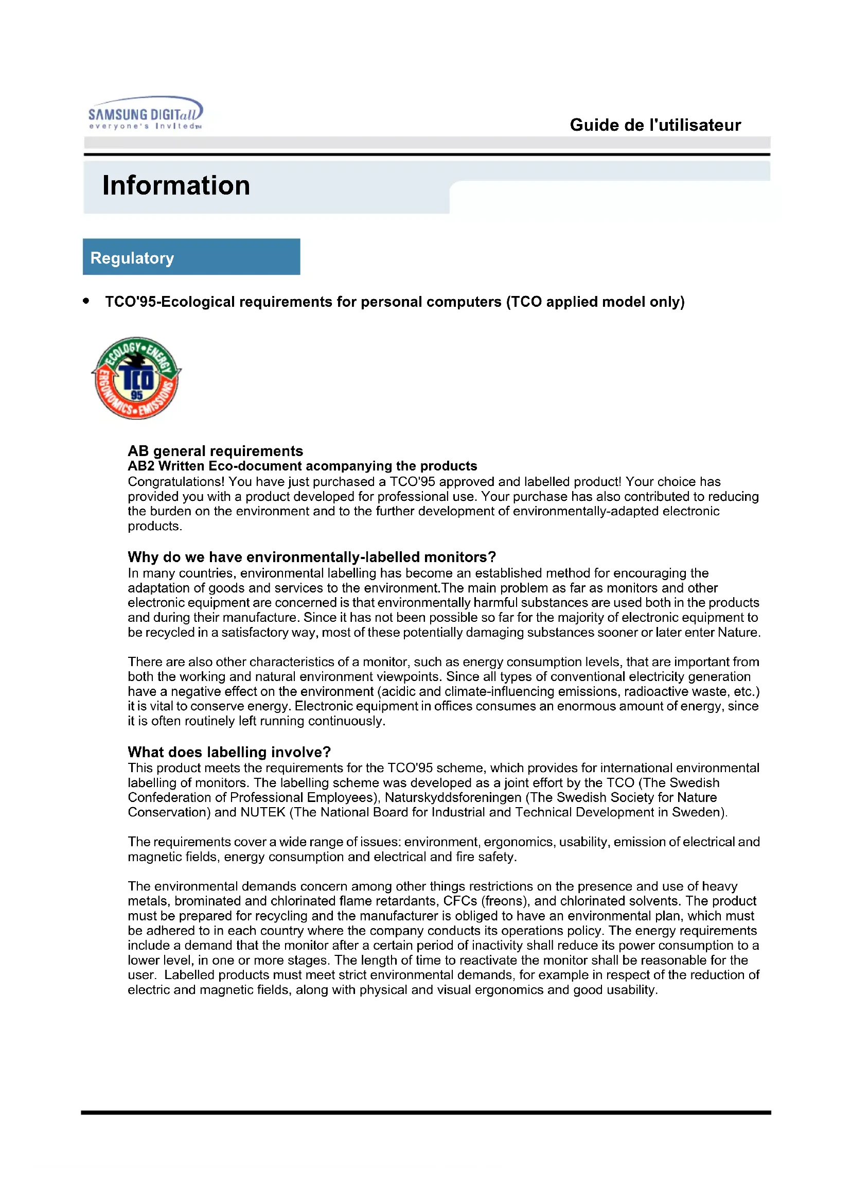 TCO'95-Ecological requirements for personal computers (TCO applied model only) AB general requirements AB2 Written Eco-document acompanying the productsCongratulations! You have just purchased a TCO'95 approved and labelled product! Your choice has provided you with a product developed for professional use. Your purchase has also contributed to reducing the burden on the environment and to the further development of environmentally-adapted electronic products. Why do we have environmentally-labelled monitors? In many countries, environmental labelling has become an established method for encouraging the adaptation of goods and services to the environment.The main problem as far as monitors and other electronic equipment are concerned is that environmentally harmful substances are used both in the products and during their manufacture. Since it has not been possible so far for the majority of electronic equipment to be recycled in a satisfactory way, most of these potentially damaging substances sooner or later enter Nature.There are also other characteristics of a monitor, such as energy consumption levels, that are important from both the working and natural environment viewpoints. Since all types of conventional electricity generation have a negative effect on the environment (acidic and climate-influencing emissions, radioactive waste, etc.) it is vital to conserve energy. Electronic equipment in offices consumes an enormous amount of energy, since it is often routinely left running continuously. What does labelling involve? This product meets the requirements for the TCO'95 scheme, which provides for international environmental labelling of monitors. The labelling scheme was developed as a joint effort by the TCO (The Swedish Confederation of Professional Employees), Naturskyddsforeningen (The Swedish Society for Nature Conservation) and NUTEK (The National Board for Industrial and Technical Development in Sweden).The requirements cover a wide range of issues: environment, ergonomics, usability, emission of electrical and magnetic fields, energy consumption and electrical and fire safety. The environmental demands concern among other things restrictions on the presence and use of heavy metals, brominated and chlorinated flame retardants, CFCs (freons), and chlorinated solvents. The product must be prepared for recycling and the manufacturer is obliged to have an environmental plan, which must be adhered to in each country where the company conducts its operations policy. The energy requirements include a demand that the monitor after a certain period of inactivity shall reduce its power consumption to a lower level, in one or more stages. The length of time to reactivate the monitor shall be reasonable for the user. Labelled products must meet strict environmental demands, for example in respect of the reduction of electric and magnetic fields, along with physical and visual ergonomics and good usability. RegulatoryGuide de l'utilisateur Information What does labelling involve?