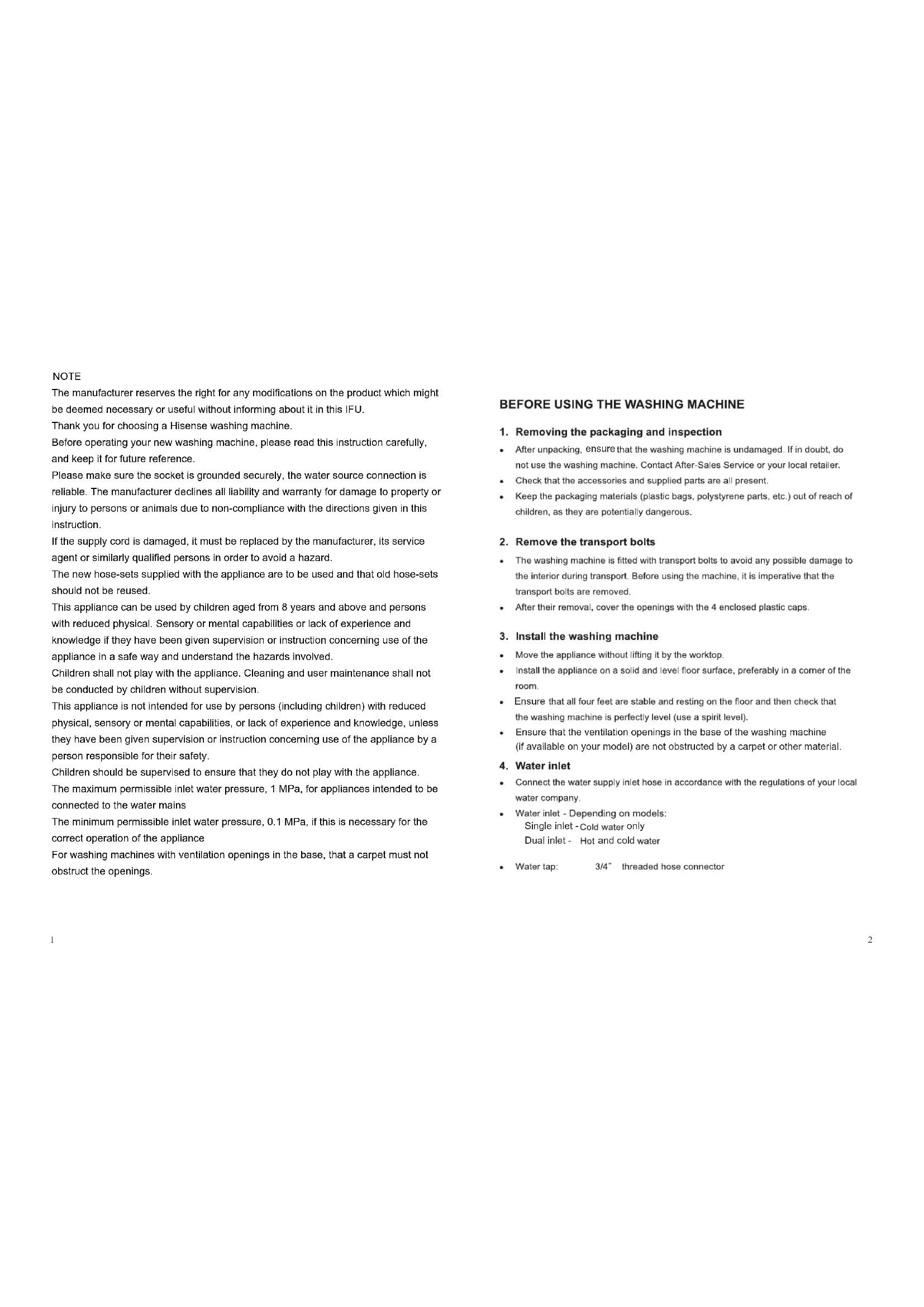 ,ylhguoroht launam siht daer esaelp ,tinu siht gnitarepo erofeB ecnerefer erutuf rof niater dna21 ensure Ensure Single inlet - Dual inlet - and cold only Ensure that the ventilation openings in the base of the washing machine (if available on your model) are not obstructed by a carpet or other material. NOTE The manufacturer reserves the right for any modifications on the product which might be deemed necessary or useful without informing about it in this IFU. Thank you for choosing a Hisense washing machine. Before operating your new washing machine, please read this instruction carefully, and keep it for future reference. Please make sure the socket is grounded securely, the water source connection is reliable. The manufacturer declines all liability and warranty for damage to property or injury to persons or animals due to non-compliance with the directions given in this instruction. If the supply cord is damaged, it must be replaced by the manufacturer, its service agent or similarly qualified persons in order to avoid a hazard. The new hose-sets supplied with the appliance are to be used and that old hose-sets should not be reused. This appliance can be used by children aged from 8 years and above and persons with reduced physical. Sensory or mental capabilities or lack of experience and knowledge if they have been given supervision or instruction concerning use of the appliance in a safe way and understand the hazards involved. Children shall not play with the appliance. Cleaning and user maintenance shall not be conducted by children without supervision. This appliance is not intended for use by persons (including children) with reduced physical, sensory or mental capabilities, or lack of experience and knowledge, unless they have been given supervision or instruction concerning use of the appliance by a person responsible for their safety. Children should be supervised to ensure that they do not play with the appliance. The maximum permissible inlet water pressure, 1 MPa, for appliances intended to be connected to the water mains The minimum permissible inlet water pressure, 0.1 MPa, if this is necessary for the correct operation of the appliance For washing machines with ventilation openings in the base, that a carpet must not obstruct the openings.3 The symbol on the product, or on the documents accompanying the product, indicates that this appliance may not be treated as household waste. Instead it shall be handed over to the applicable collection point for the recycling of electrical and electronic equipment. Disposal must be carried out in accordance with local environmental regulations for waste disposal. For more detailed information about treatment, recovery and recycling of this product, please contact your local city office, your household waste disposal service or the shop where you purchased the product.