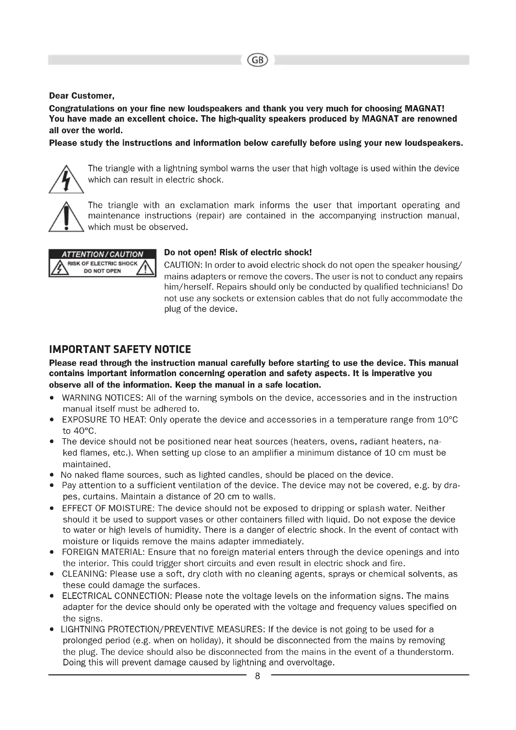 - Folgeschäden an fremden Geräten • Kostenerstattung bei Schadensbehebung durch Dritte ohne unser vorheriges Einverständnis. Congratulations! You have made a wise selection in becoming the owner of a MAGNAT HiFi equipment. Due to high quality MAGNAT HiFi products have earned an excellent reputation through the western world. And this high quality standard enables us to grant a 5-years warranty for MAGNAT HiFi speakers and a 2-years warranty for MAGNAT HiFi-electronic components. The equipments are checked and tested continously during the entire production process. In case you have problems with your MAGNAT HiFi equipment, kindly observe the following: