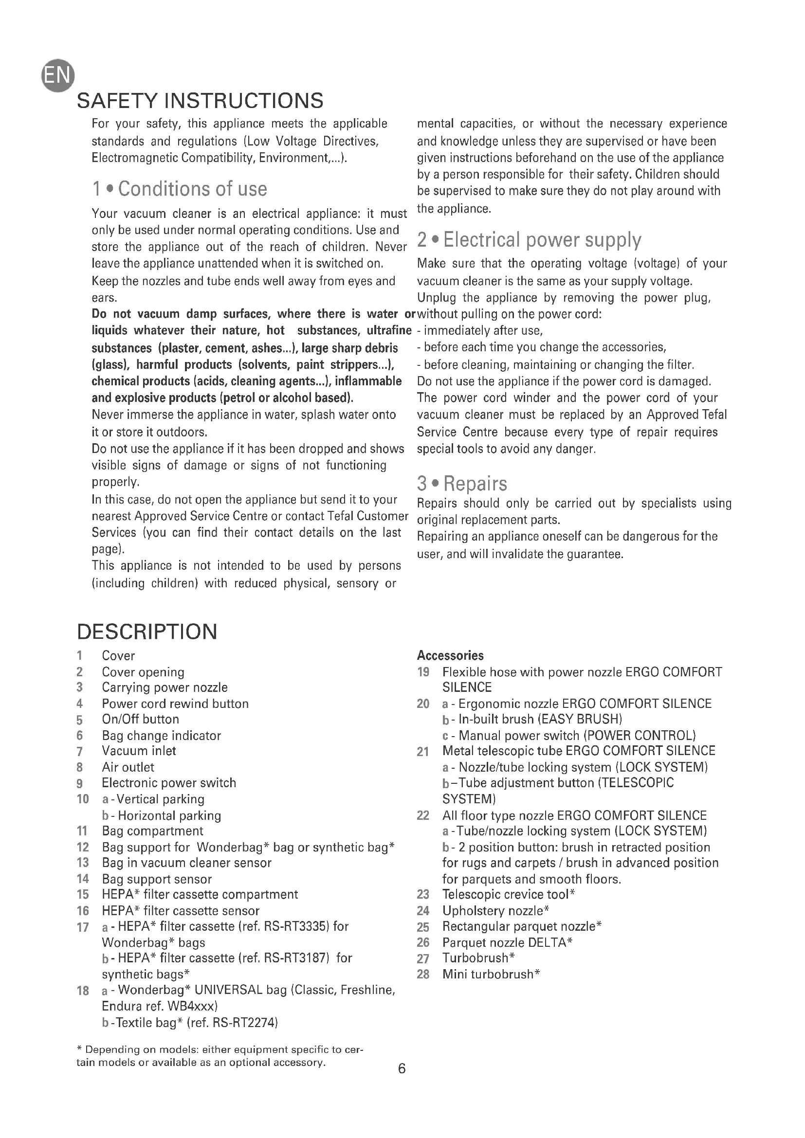 - Selon modèles : il s’agit d’équipements spécifiques à certains modèles ou d’accessoires disponibles en option.6 For your safety, this appliance meets the applicable standards and regulations (Low Voltage Directives, Electromagnetic Compatibility, Environment,...). 1 • Conditions of use Your vacuum cleaner is an electrical appliance: it must only be used under normal operating conditions. Use and store the appliance out of the reach of children. Never leave the appliance unattended when it is switched on. Keep the nozzles and tube ends well away from eyes and ears. Do not vacuum damp surfaces, where there is water or liquids whatever their nature, hot substances, ultrafine substances (plaster, cement, ashes...), large sharp debris (glass), harmful products (solvents, paint strippers...), chemical products (acids, cleaning agents...), inflammable and explosive products (petrol or alcohol based). Never immerse the appliance in water, splash water onto it or store it outdoors. Do not use the appliance if it has been dropped and shows visible signs of damage or signs of not functioning properly. In this case, do not open the appliance but send it to your nearest Approved Service Centre or contact Tefal Customer Services (you can find their contact details on the last page). This appliance is not intended to be used by persons (including children) with reduced physical, sensory or mental capacities, or without the necessary experience and knowledge unless they are supervised or have been given instructions beforehand on the use of the appliance by a person responsible for their safety. Children should be supervised to make sure they do not play around with the appliance. 2 • Electrical power supply Make sure that the operating voltage (voltage) of your vacuum cleaner is the same as your supply voltage. Unplug the appliance by removing the power plug, without pulling on the power cord: - immediately after use, - before each time you change the accessories, - before cleaning, maintaining or changing the filter. Do not use the appliance if the power cord is damaged. The power cord winder and the power cord of your vacuum cleaner must be replaced by an Approved Tefal Service Centre because every type of repair requires special tools to avoid any danger. 3 • Repairs Repairs should only be carried out by specialists using original replacement parts. Repairing an appliance oneself can be dangerous for the user, and will invalidate the guarantee. DESCRIPTION