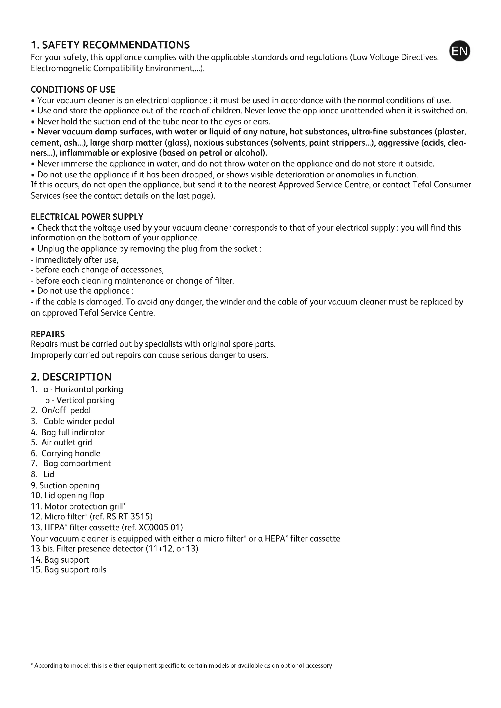 - Do not use the appliance : - if the cable is damaged. To avoid any danger, the winder and the cable of your vacuum cleaner must be replaced by an approved Tefal Service Centre. REPAIRS Repairs must be carried out by specialists with original spare parts. Improperly carried out repairs can cause serious danger to users.