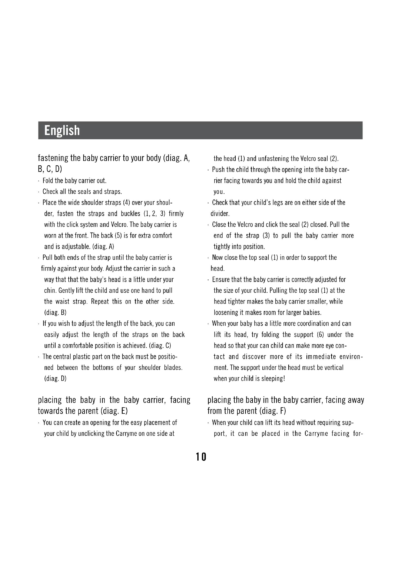 All front/back descriptions in the text assume that the user is wearing the baby carrier as depicted in diag. A.